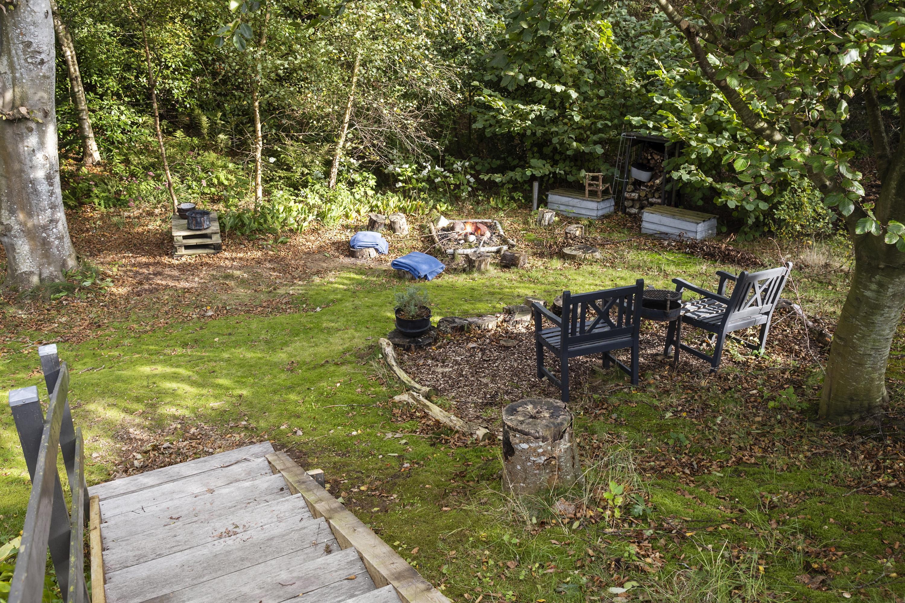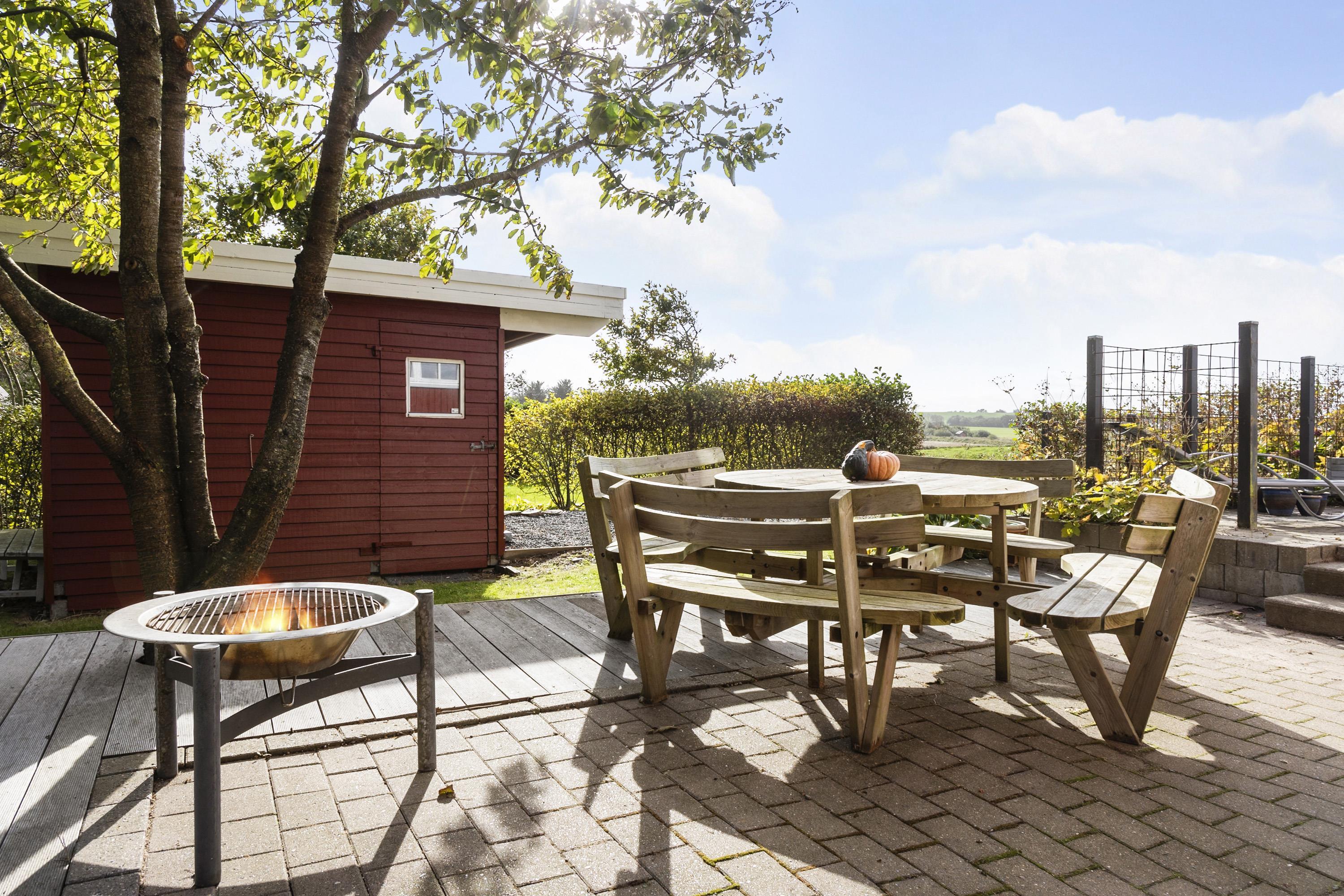 Huset er omgivet af terrasser med morgensol, middagssol og aftensol. Der er et udekøkken og grill. Ved bålstedet i den lille skovhave kan man lave fx skumfiduser, popcorn eller snobrød. For de aktive er der en trampolin i haven, og går man ned til stranden, er der en sansegynge og fodboldbål.