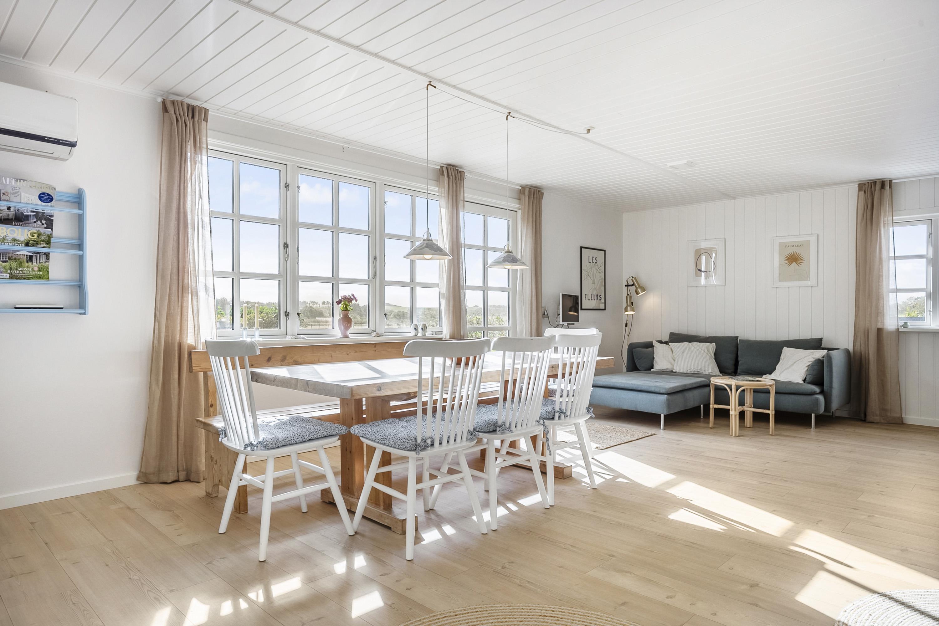 Dette smukke feriehus ved Søndbjerg Strand på Thyholm ligger på en stor grund på 1320 kvadratmeter med terrasser rundt om huset og en hyggelig lille ugeneret skovhave med stor bålplads. Fra huset er der gennem de fine sprossevinduer udsigt til marker, hvorpå der ofte ses harer og rådyr. Huset er beliggende på en rolig vej uden trafikstøj.