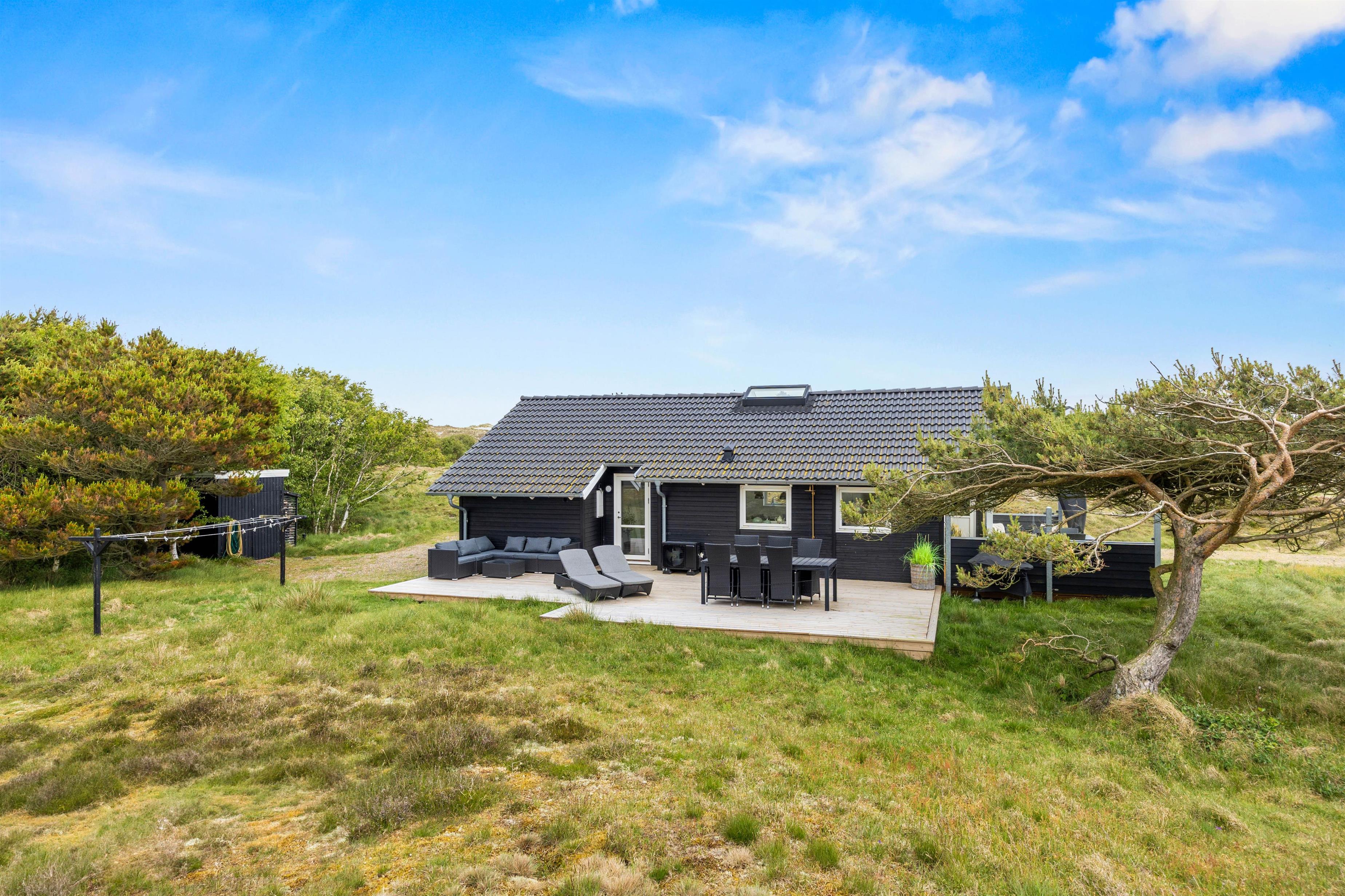 Feriehuset er omgivet af en stor natur- og klitgrund, som giver dig følelsen af at bo midt i Fanø-landskabet. På den åbne terrasse kan du starte dagen med morgenmad i det fri eller slutte aftenen med et glas vin. De omkringliggende klitter giver beskyttelse mod vinden og udgør samtidig en naturlig kulisse, som gør hvert øjeblik på terrassen til noget særligt. Børnene har masser af plads til at lege og løbe rundt, mens du kan læne dig tilbage og slappe af.