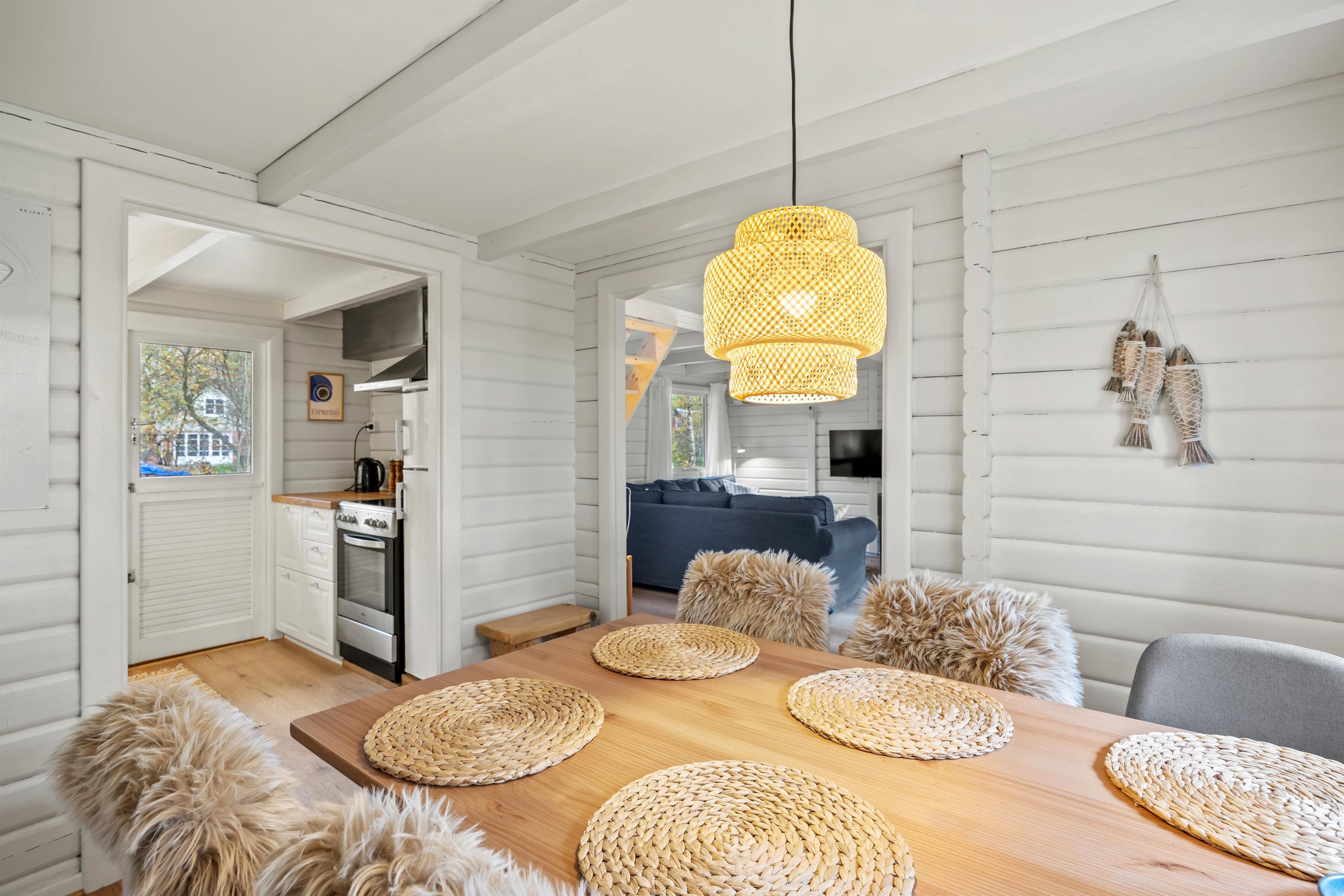 Indenfor finder I et velindrettet sommerhus, der kan rumme op til 6 personer, fordelt på 3 soverum med komfortable dobbeltsenge. Det fuldt udstyrede køkken har blandt andet en moderne opvaskemaskine, så I nemt kan håndtere dagens praktiske gøremål. På de køligere aftener kan I nyde atmosfæren skabt af brændeovnens knitren og lune jer ved hjælp af en effektiv luft til luft varmepumpe.