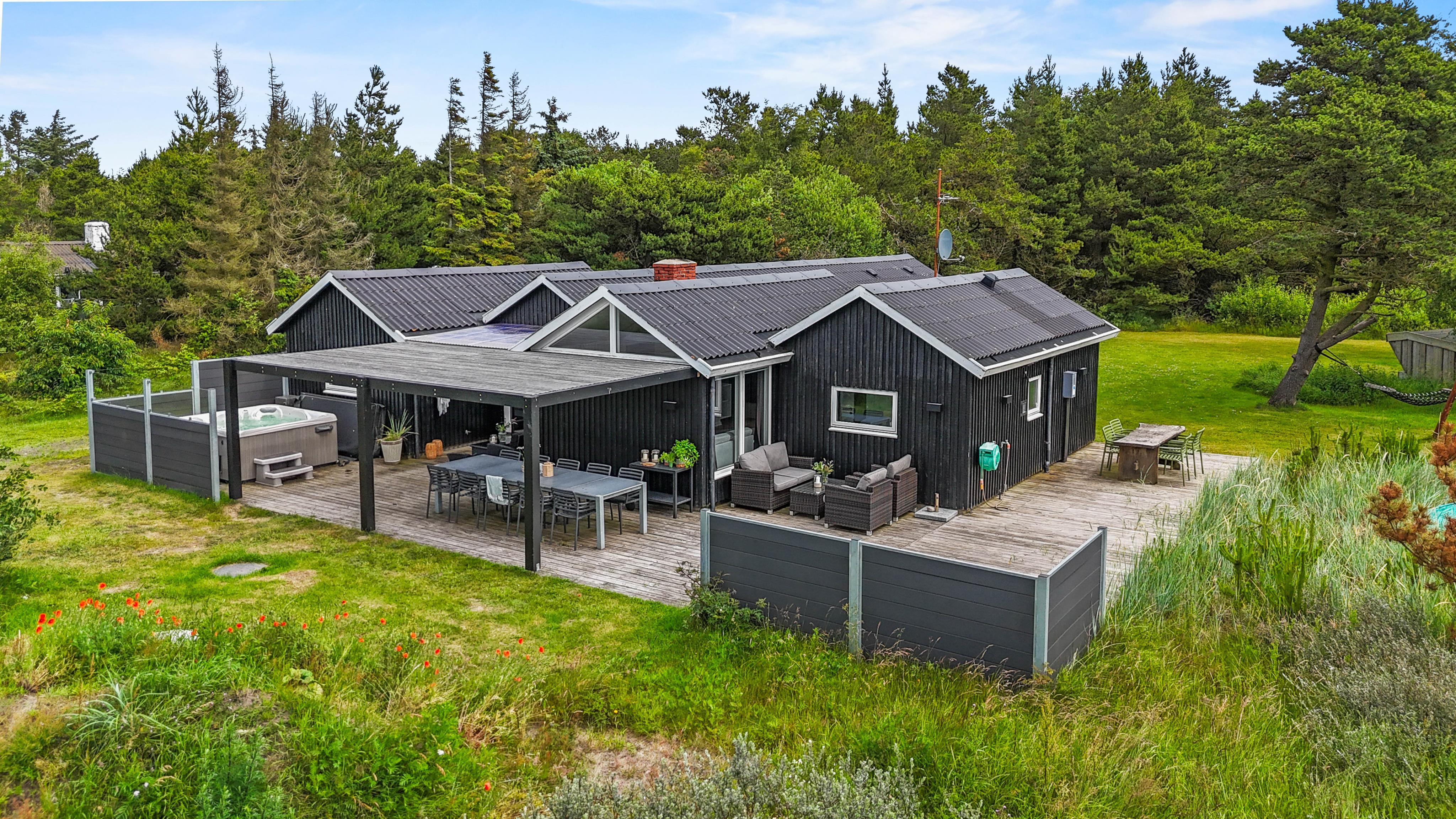 Fra spisestuen har I adgang til en skøn træterrasse med udespa, havemøbler og grill. Her kan I nyde solen, det boblende varme vand eller sætte jer til rette under den overdækkende del af terrassen, hvor en loungesofa venter på jer. Sæt jer godt til rette evt. med en kold cola eller drink, mens solen langsomt går ned og lyskæden i loftet lyser som stjerner.