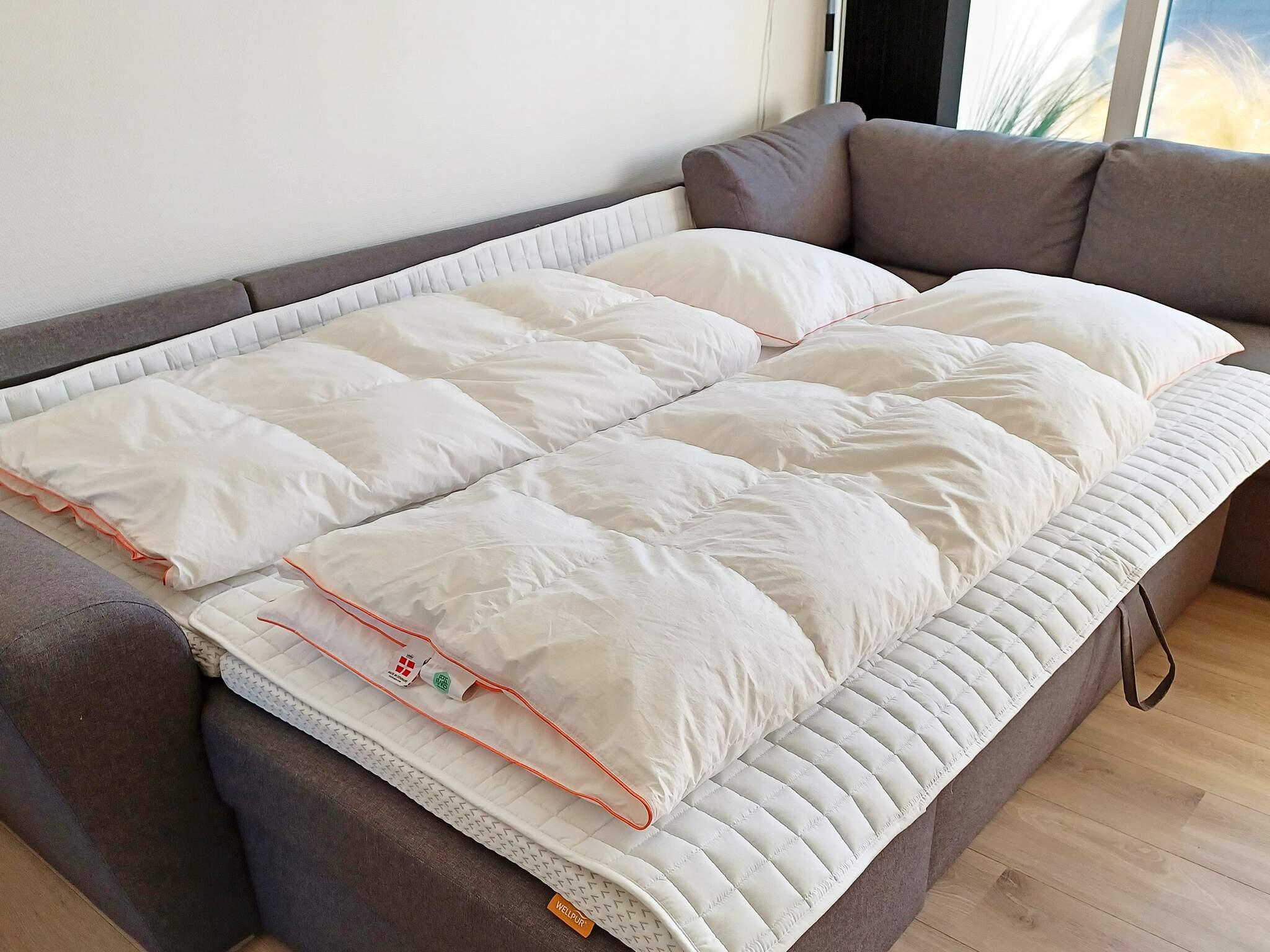 Lejligheden ligger i stueetagen og har et åbent køkken og opholdsstue med store vinduer og en havedør, der fører til en lille overdækket terrasse. Herfra kan du nyde Nordsøens beroligende lyde, mens du slapper af udendørs. Opholdsområdet omfatter en sovesofa til to ekstra gæster. Soveværelset indeholder en dobbeltseng og en køjeseng med to 160 cm lange senge, velegnet til to børn.