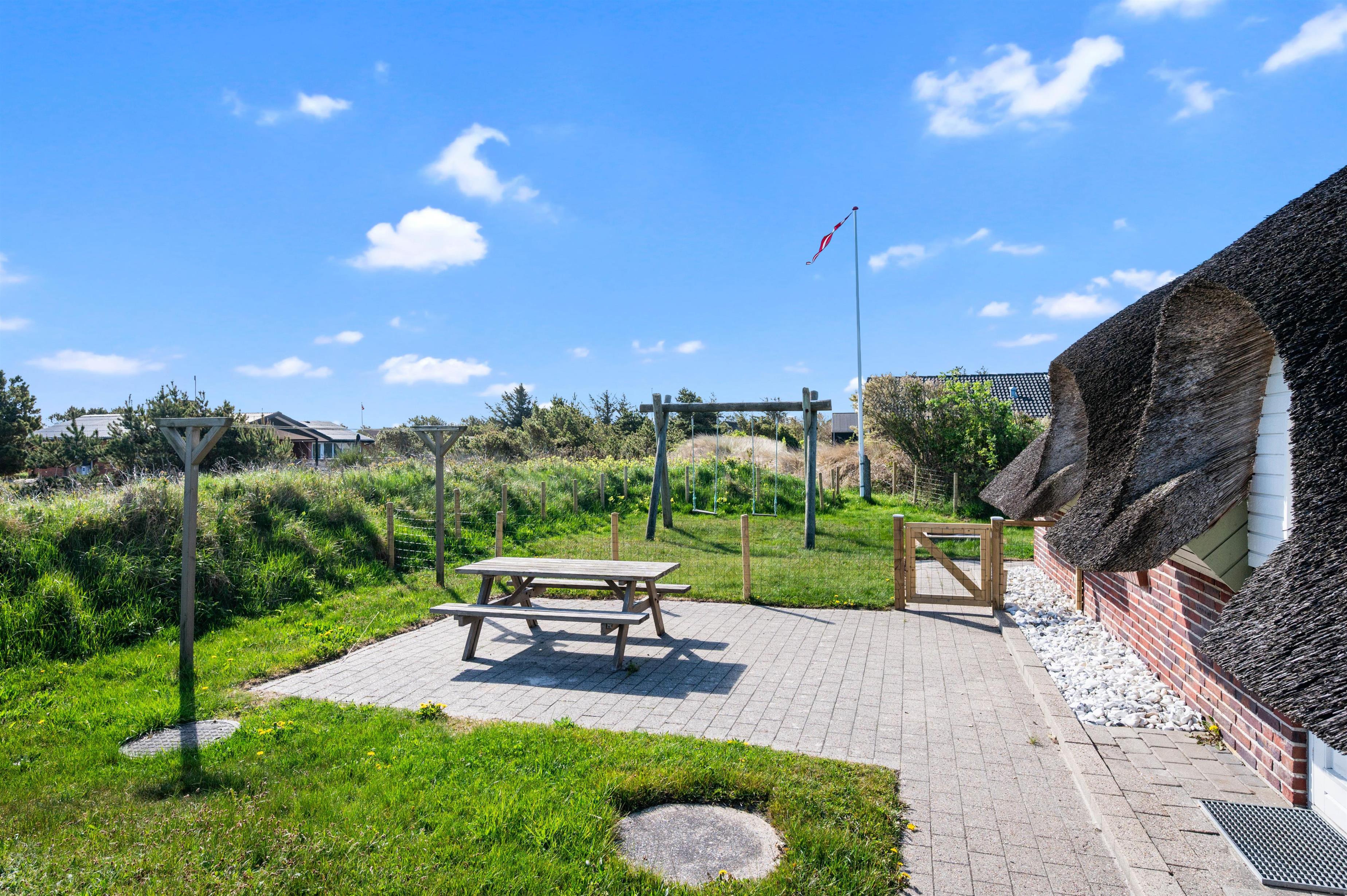 Ud mod syd finder I en dejlig terrasse udstyret med havemøbler, parasol og liggestole, hvor I kan nyde godt af solens stråler på de varme dage. Derudover har huset også en lille hyggelig terrasse mod øst, hvor I kan nyde morgenkaffen på de skønne sommerdage, mens børnene har glæde af det tilhørende gyngestativ.
