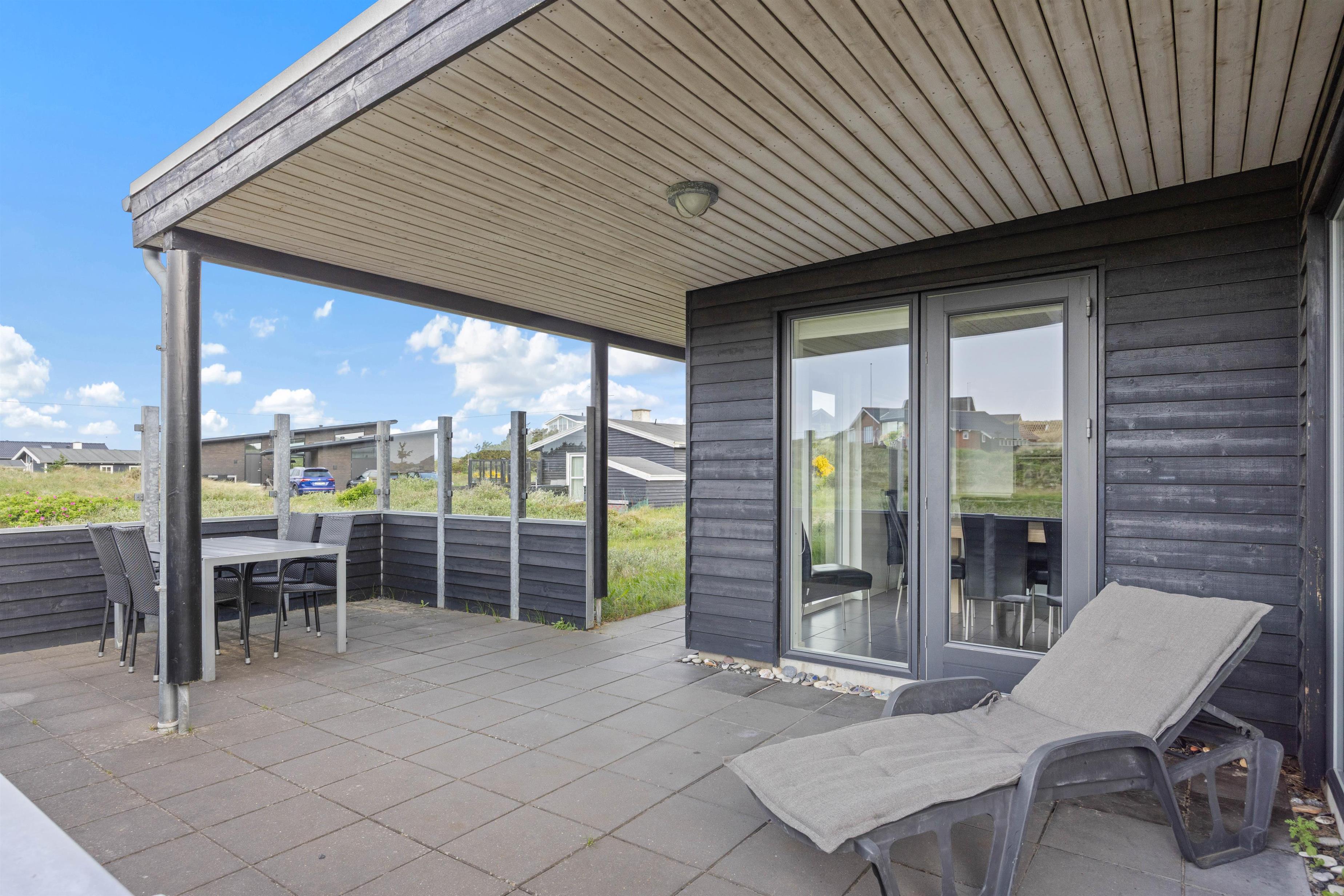 Også i husets uderum er der kælet for detaljerne. Her har man skabt hyggelige oaser rundt om huset, så du kan følge solens gang over himlen. Huset har en dejlig overdækket terrasse, som inviterer til lange, hyggelige sommeraftener i den friske luft. Her er det oplagt at nyde en god middag og en god flaske vin, mens børnene leger. Besøger I huset i den tidlige forårssæson vil den afskærmede terrasse desuden give læ og mulighed for at sidde ude og mærke de allerførste, varme forårsstråler i ansigtet.