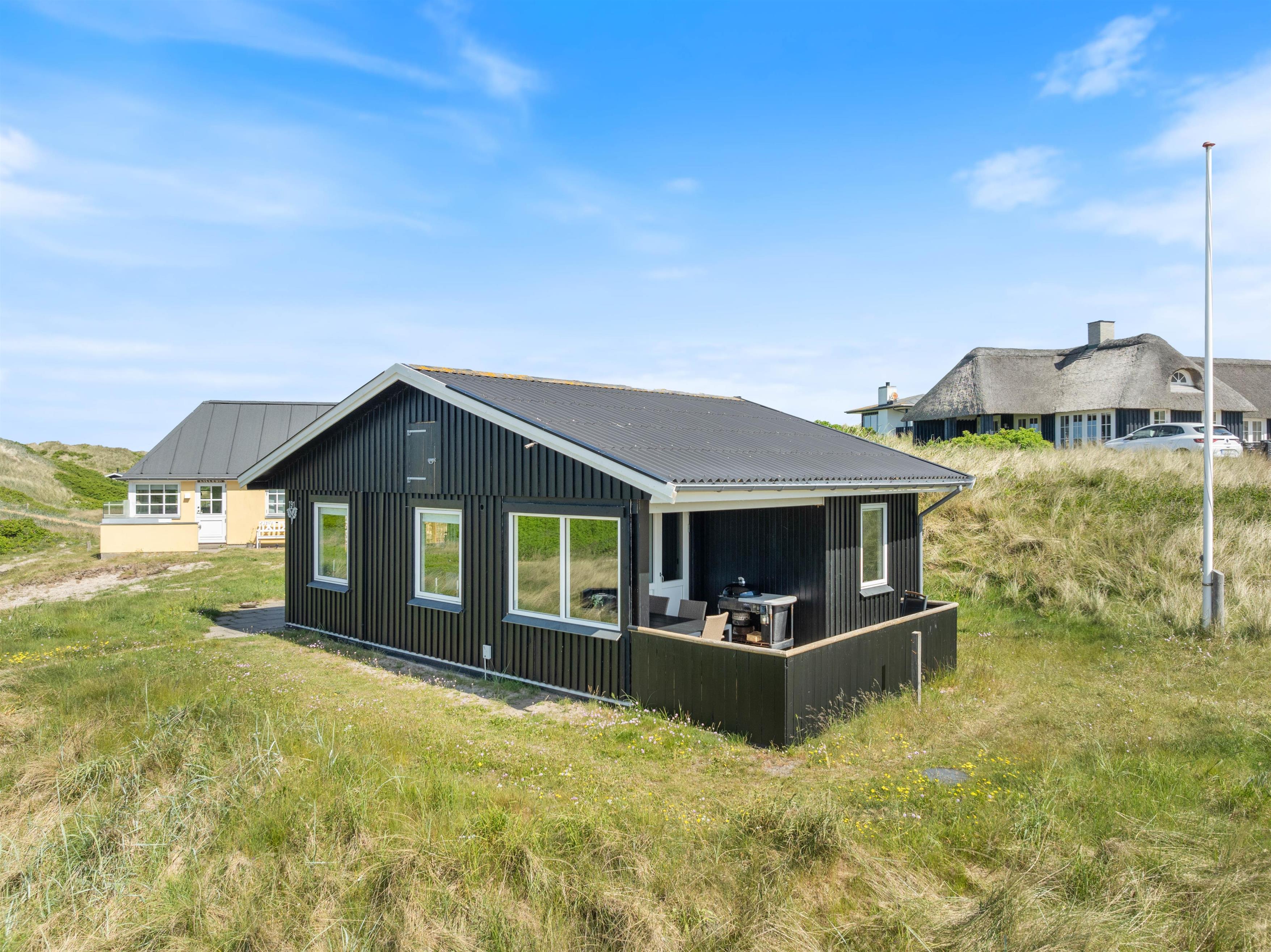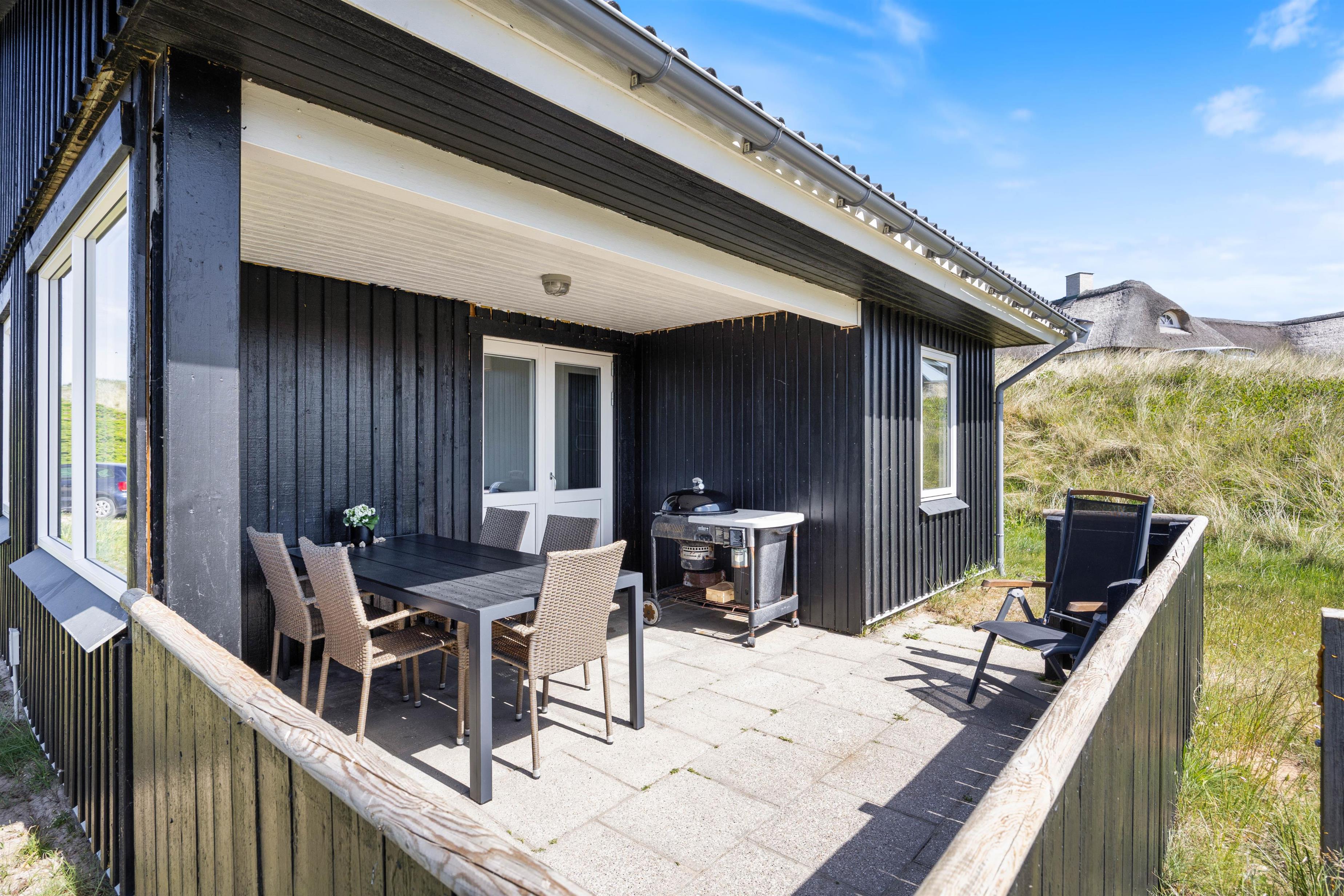 Det er ikke kun inde at sommerhuset byder op til afslapning og hygge. De skønne udearealer byder i den grad også op til udehygge og afslapning. Også selv når vejret ikke lige helt spiller, kan I med fordel nyde den friske Vesterhavsluft og lyden af Vesterhavets vilde brusen. Husets terrasse er nemlig både overdækket, afskærmet og næsten lukket, så her er dejligt med læ. Der er selvfølgelig også havemøbler og en grill. Grillen giver jer også mulighed for at flytte noget af madlavningen udenfor.