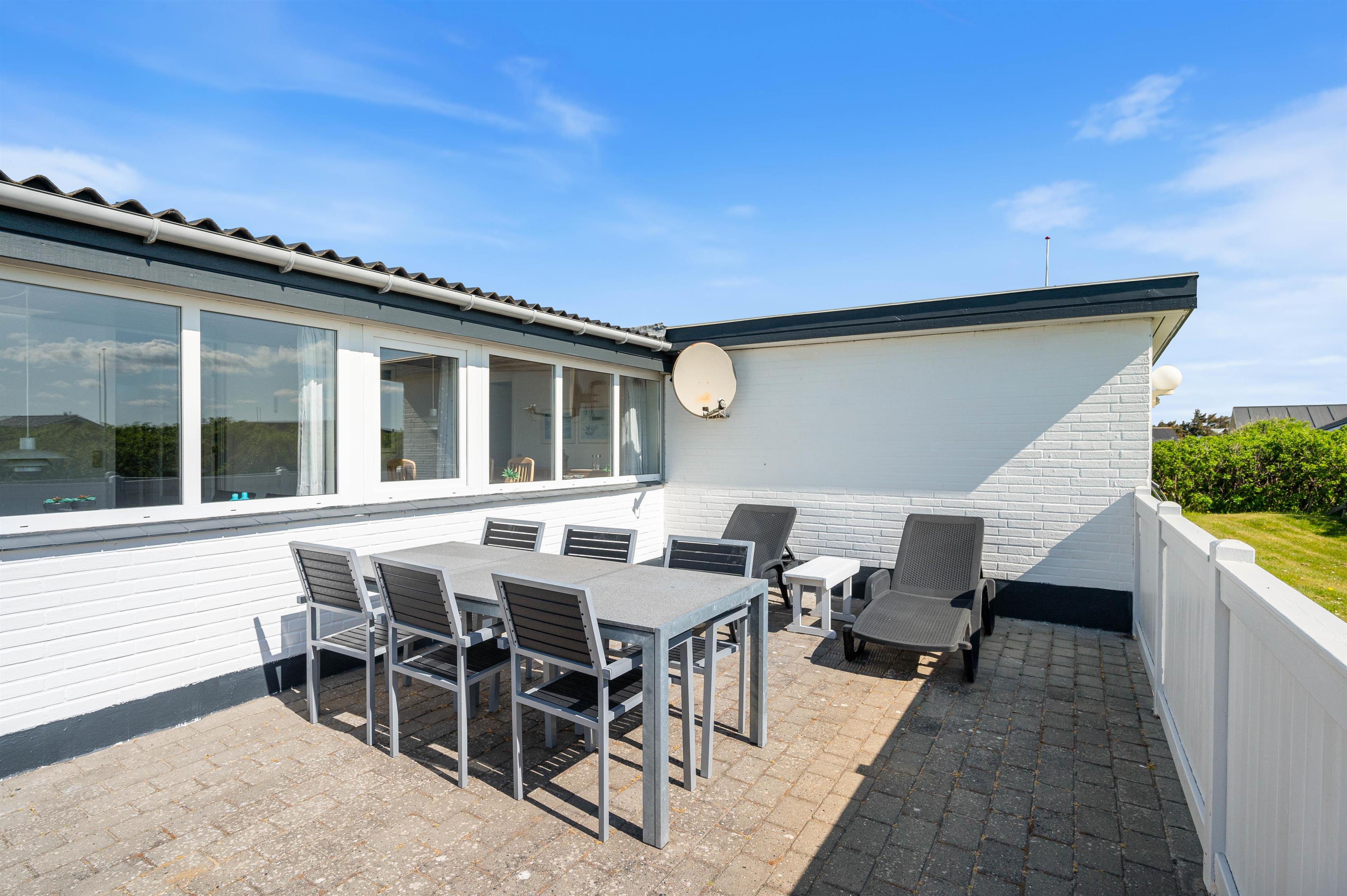 Uden for udestuen er der en stor, syd-østvendt terrasse. Liggestole og havemøbler er der selvfølgelig sørget for, så I kan nyde jeres ophold til fulde. Her er også grill til rådighed, så I kan tilberede jeres måltider over de glødende kul. Terrassen er aflukket, hvilket gør den ideel til børnefamilier og hundeejere, så de små ikke forvilder sig ud på egen hånd.