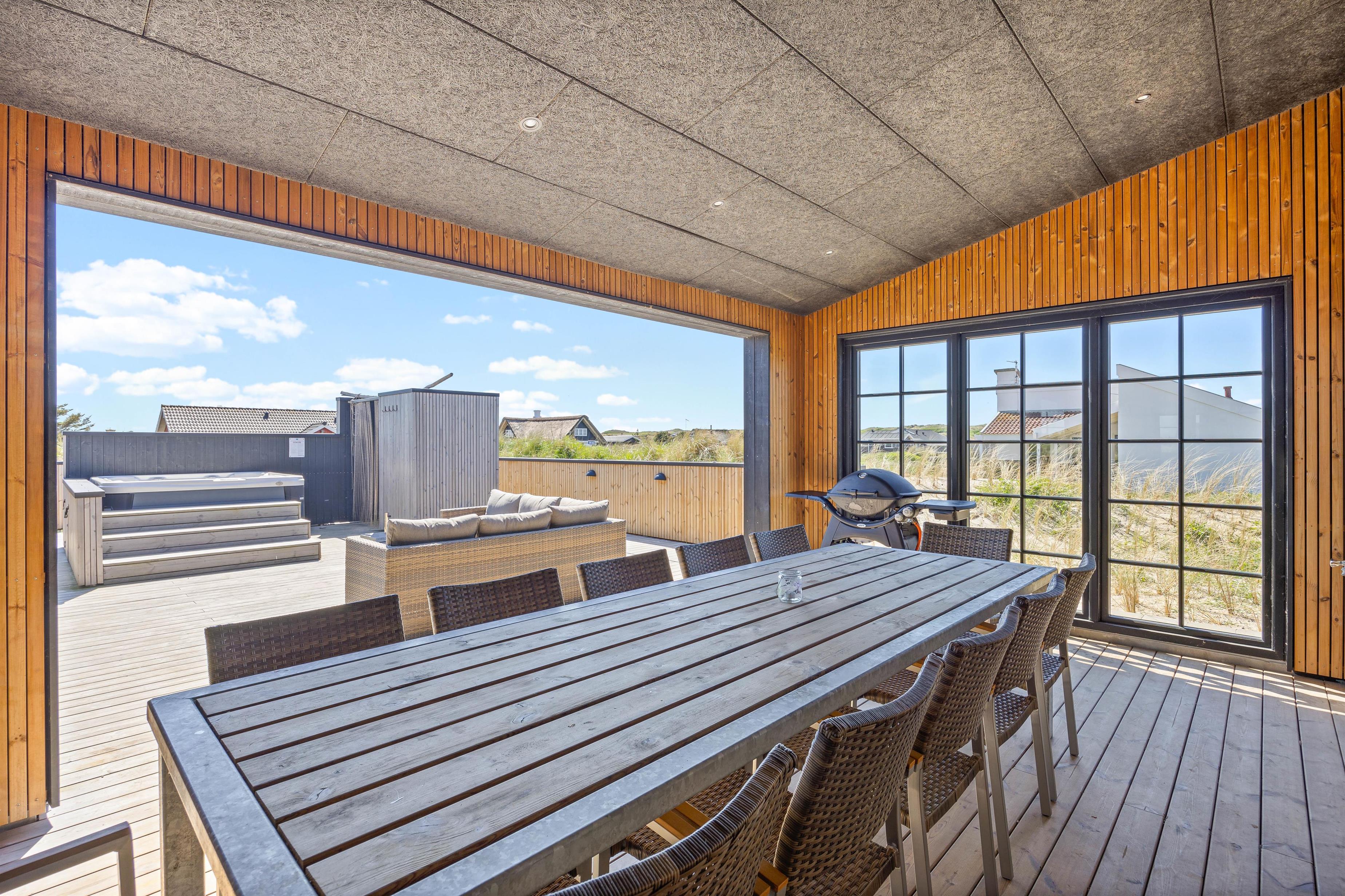 På den dejlige terrasse ved sommerhuset er der sørget for, at I kan nyde jeres ferie i fulde drag. Her er der flere forskellige områder, hvor I kan slappe af og nyde ferien. Den overdækkede del af terrassen er helt oplagt til de lange aftener, hvor I kan tilberede aftensmaden ved hjælp af sommerhusets gasgrill.