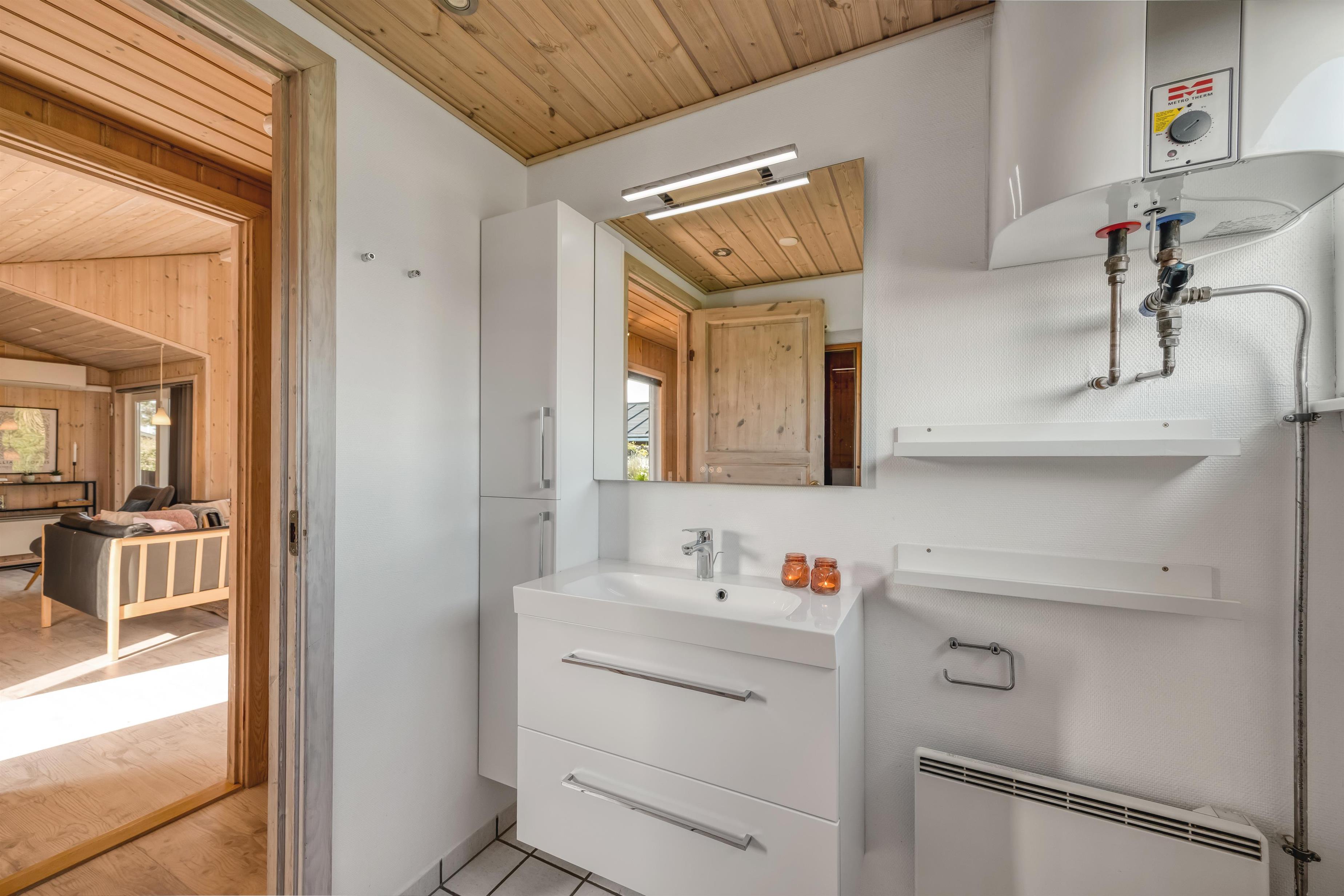 Boligen er udstyret med et moderne badeværelse, der inkluderer både toilet, bruser og gulvvarme, så du kan nyde komforten ved en varm bruser efter en lang dag. Den hyggelige stue er udstyret med en brændeovn, som skaber en varm og indbydende atmosfære, mens den energibesparende varmepumpe, der også kan fungere som aircondition, sørger for et behageligt indeklima året rundt.