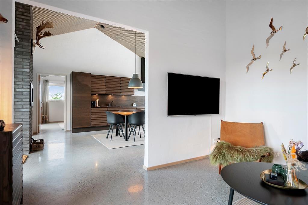 Husets hjerte er det store køkkenalrum og opholdsstuen, hvor ferielivet naturligt samler sig. Her er plads til madlavning, gode snakke og brætspil omkring spisebordet, mens lyset strømmer ind gennem de store vinduer. Køkkenet er veludstyret og inkluderer blandt andet vinkøleskab, så du altid har et godt glas vin lige ved hånden til de lange sommeraftener. Indretningen er enkel og indbydende, og skaber en behagelig ramme om din ferie – uanset om du er én eller flere generationer afsted.