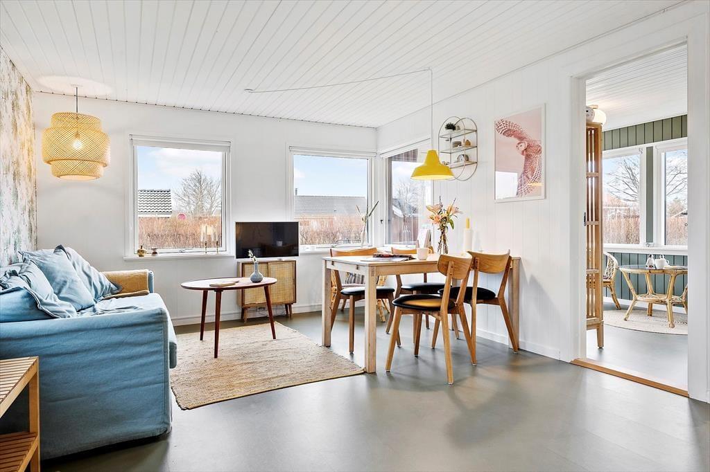 Når du træder indenfor, mødes du af en gennemført og stilfuld indretning, hvor lyse trævægge, bløde tekstiler og nøje udvalgte møbler skaber en varm og indbydende atmosfære. De store vinduespartier lader lyset strømme ind og forbinder ude og inde på en harmonisk måde, så du hele tiden har naturen som en del af oplevelsen.