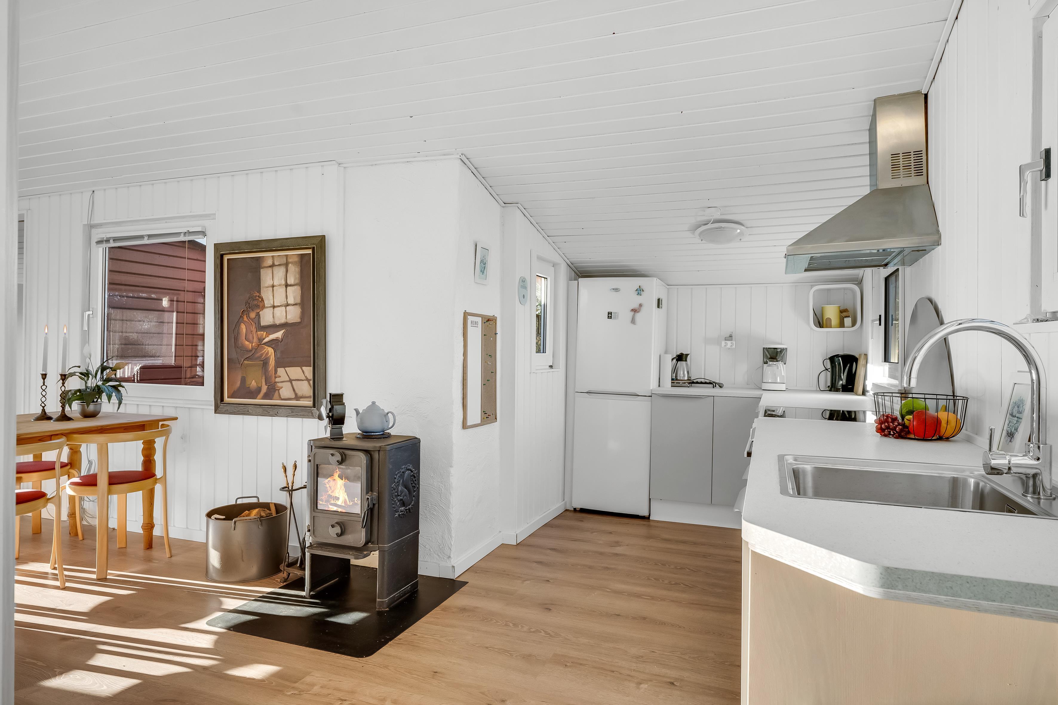 Det centrale opholdsområde består af en åben stue og køkkenløsning, hvor du kan samles med dine nærmeste. Her finder du en brændeovn, der skaber en hyggelig atmosfære på køligere dage, og en energibesparende varmepumpe, der også kan fungere som aircondition, hvilket sikrer en behagelig temperatur året rundt.