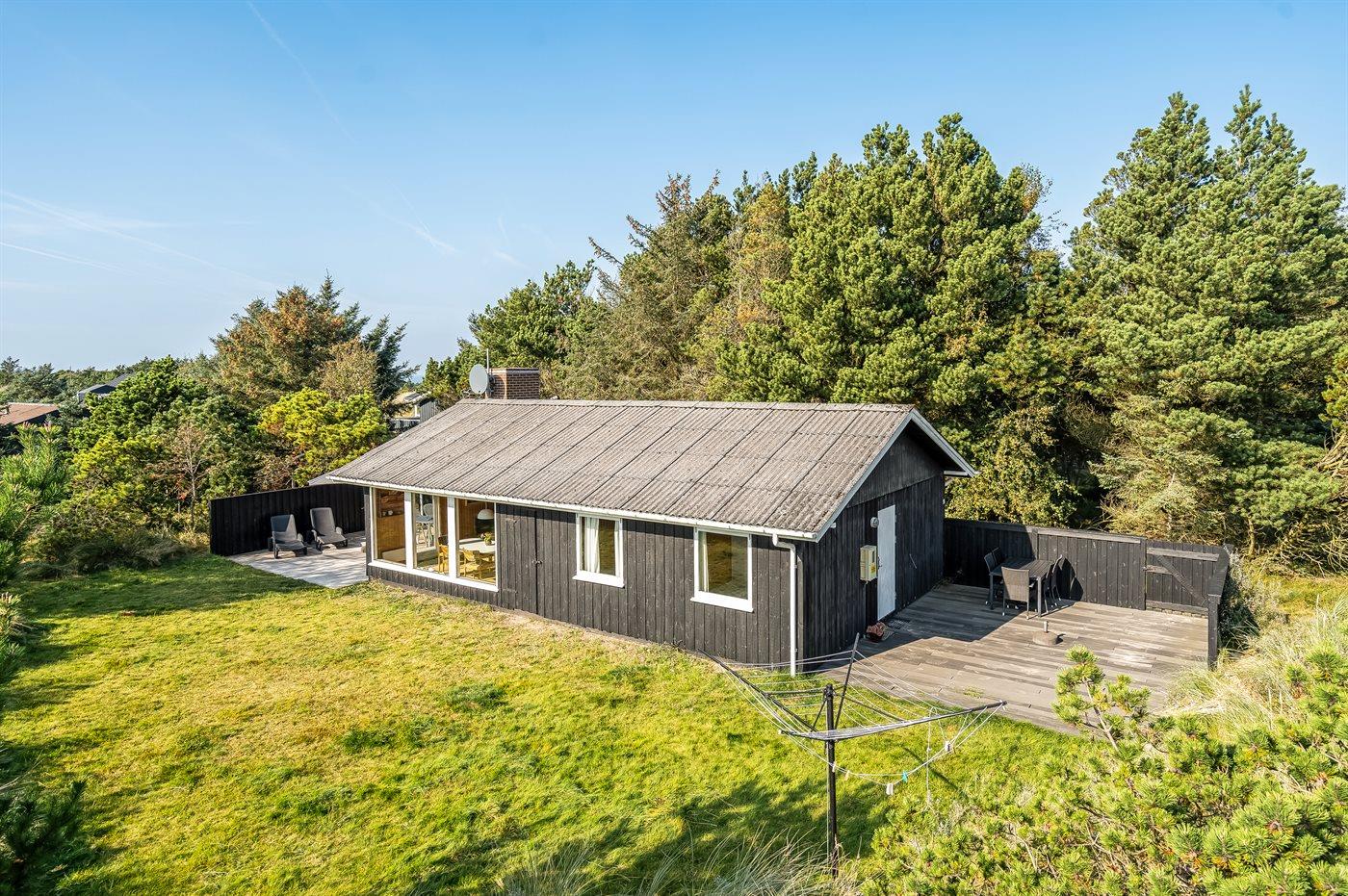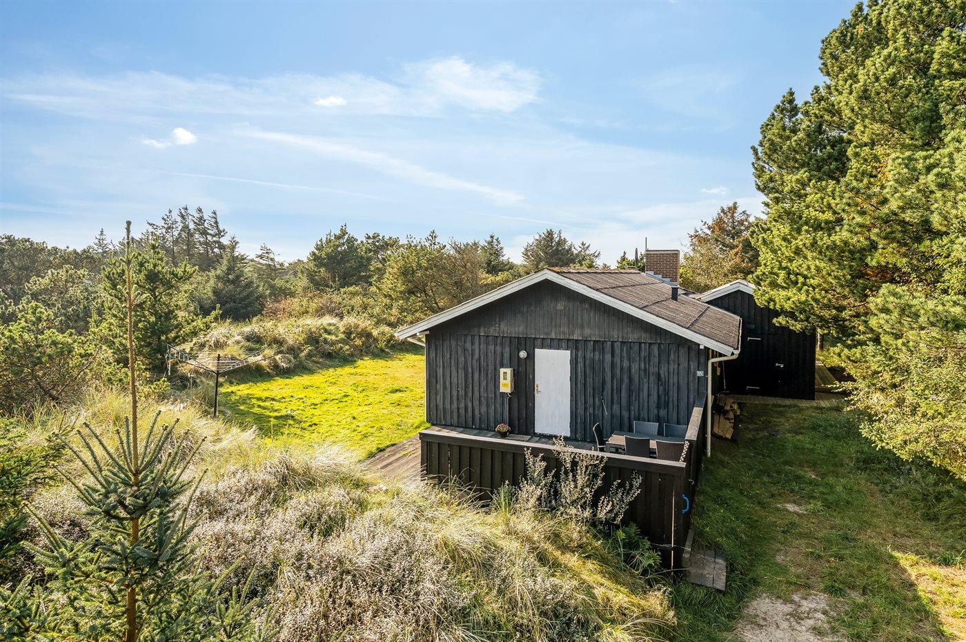 Dette rummelige sommerhus med tilbygning fra 2023 er beliggende på dejlig naturgrund med skøn udsigt over kuperet lyng- og klitlandskab. Til huset hører flere terrasser med mulighed for ophold i både sol og læ.