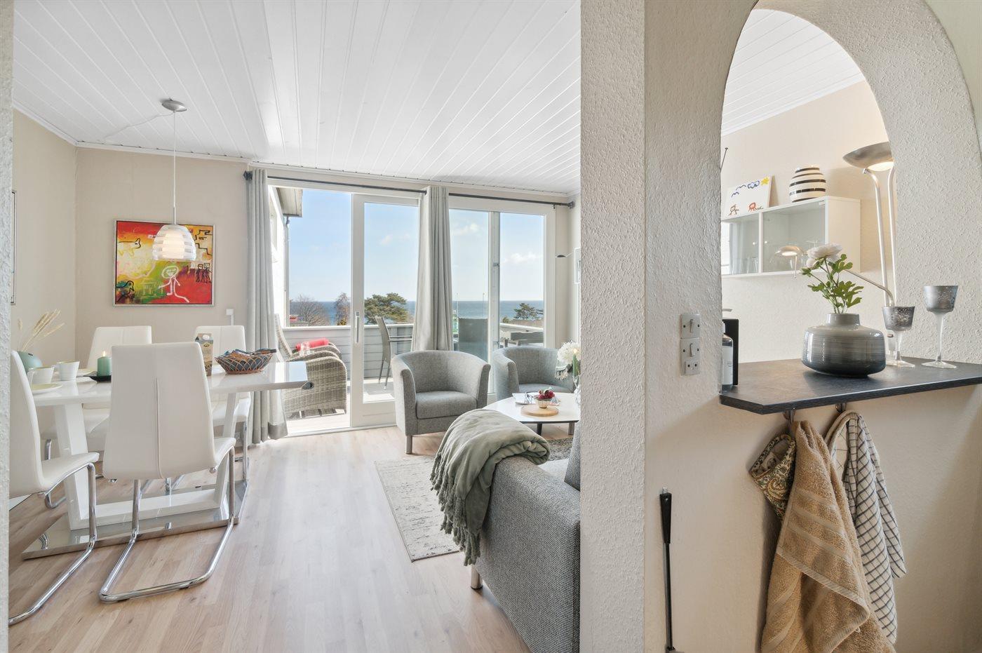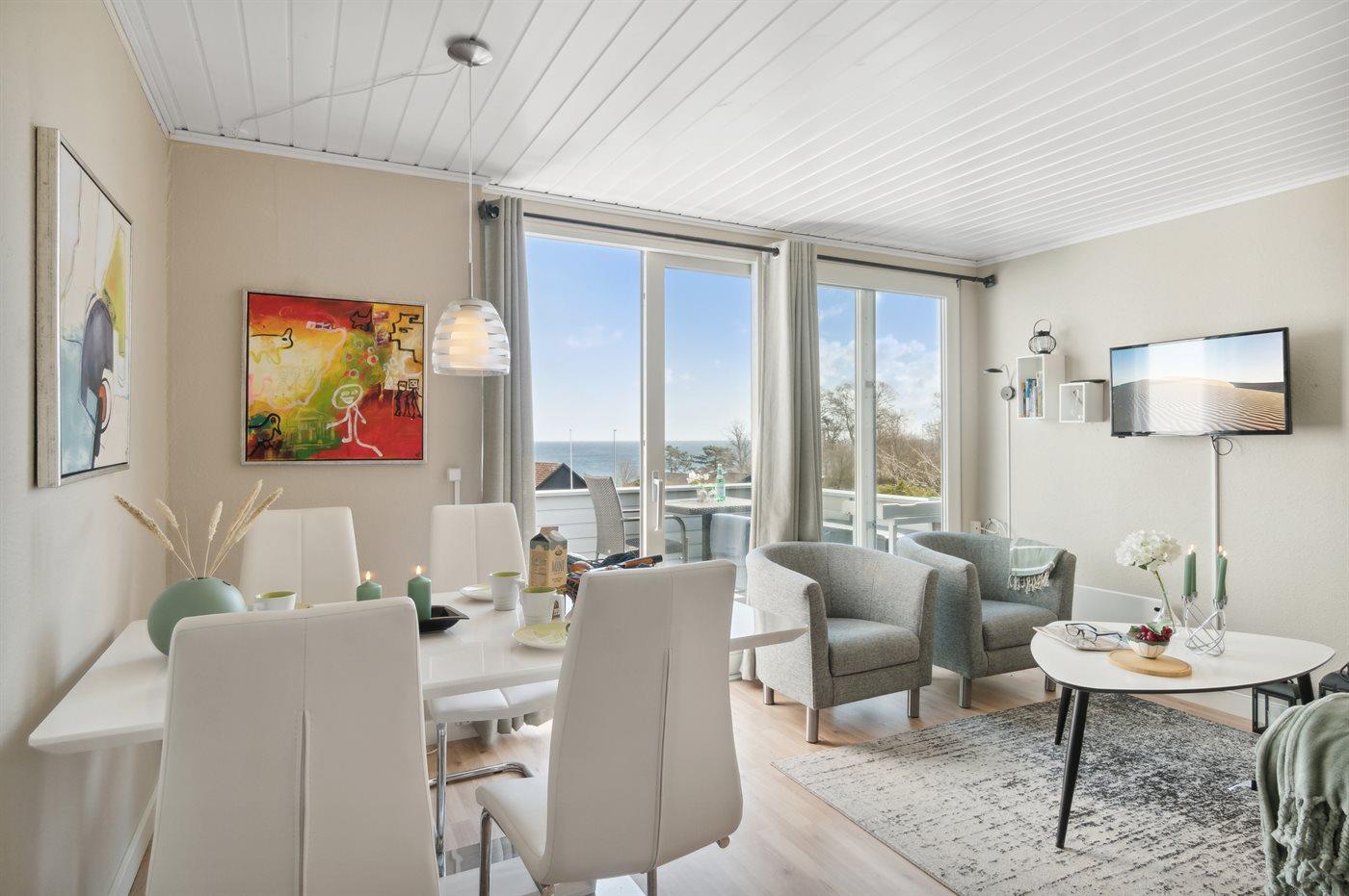 En virkelig vedligeholdt og indbydende ferielejlighed med havudsigt både fra den hyggelige stue og fra den møblerede altan, hvorfra man har et virkelig godt udkik over Østersøen. Lejligheden er indrettet, så det giver en fornemmelsen af, at der i mange detaljer er tænkt på, at det skal være rart og nemt at holde ferie i rolige omgivelser.