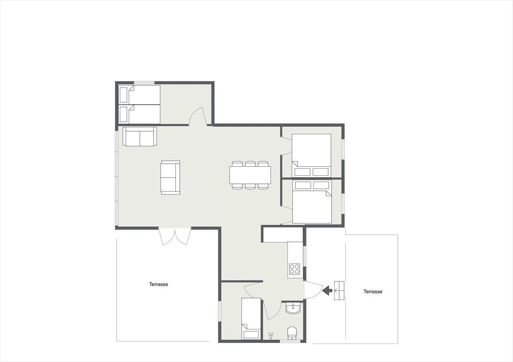 Indendørs fornemmer i rummeligheden i dette skønne sommerhus. Der er luft og albuerum i den store stue, hvor alle kan samles omkring sofabordet. Herfra kan den skønne naturgrund nydes, da der er en dejlig udsigt til haven fra det store vinduesparti. Hvad enten madlavningen er fælles eller du har vundet opgaven, så kan du stadig være en del af fællesskabet, da køkkenet ligger i åben forbindelse med stue.