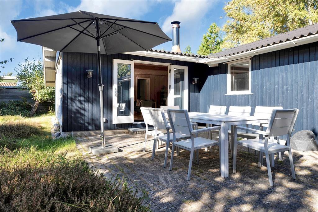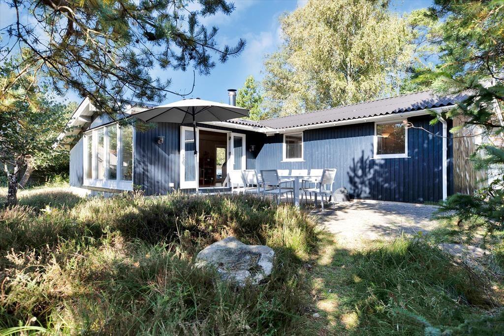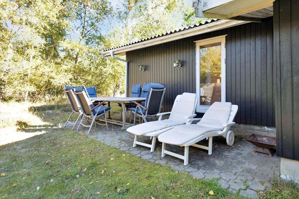 Sommerhuset er beliggende på den skønneste naturgrund med smukke træer og buske, som giver en god fornemmelse af at holde ferie ude i naturen. Der er flere gode terrassearealer hvor der kan findes både læ og sol hele dagen. På den store sydvendte terrasse kan alle samles og nyde en god frokost rundt om havebordet, og aftensolen kan nydes på den lille vestvendte med en god kop kaffe. Skal der hygges kan der tændes op i det lille bålfad og bages snobrød eller blot nyde flammerne og bålets knitren.