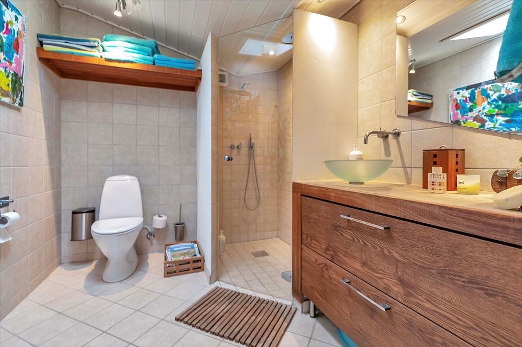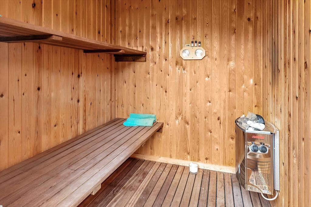 Sommerhusets hjerterum er den store dagligstue med stor tv-pakke og hurtigt internet og ligger i forbindelse med det åbne køkken. I køkkenet er der plads nok til at I kan hjælpes om tilberedningen af en god frokost og her kan du bl.a. også få friske isterninger til din drink fra det amerikanske køleskab. Der er også mulighed for at sætte sig og få en god snak ved spisebordet eller spille et hyggeligt brætspil. Der er et dejligt badeværelse med brus samt gæstetoilet. I det tilhørende anneks er der ud over et skønt soveværelse også en dejlig sauna, til fri afbenyttelse.