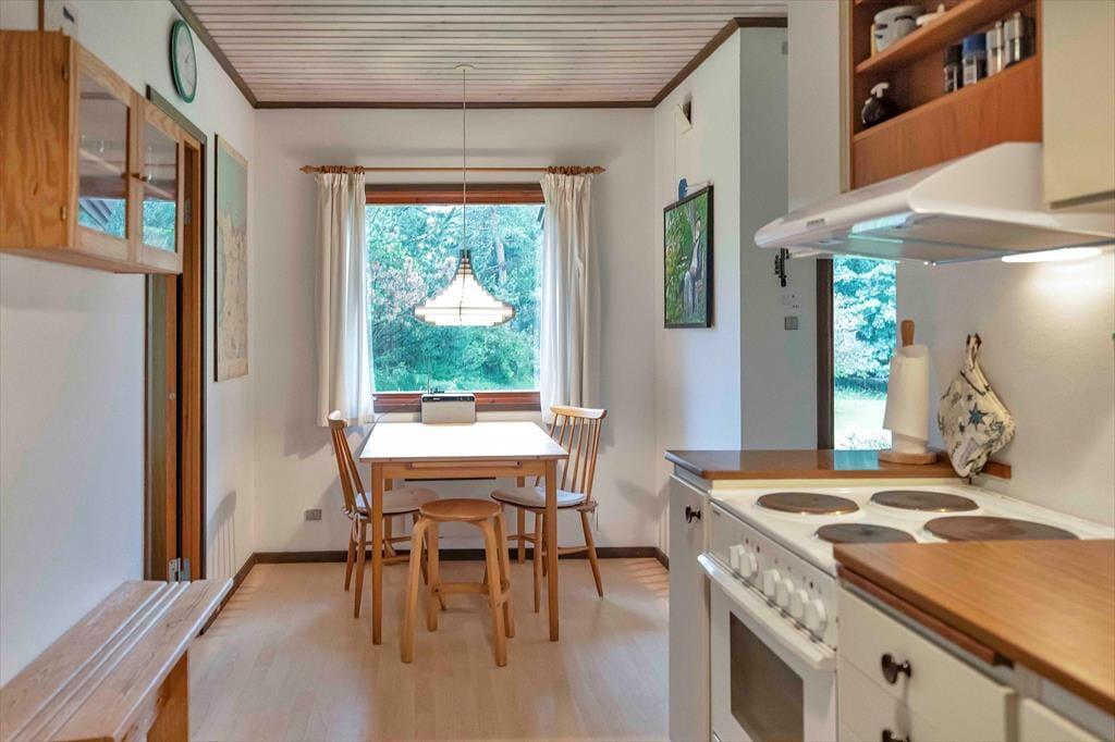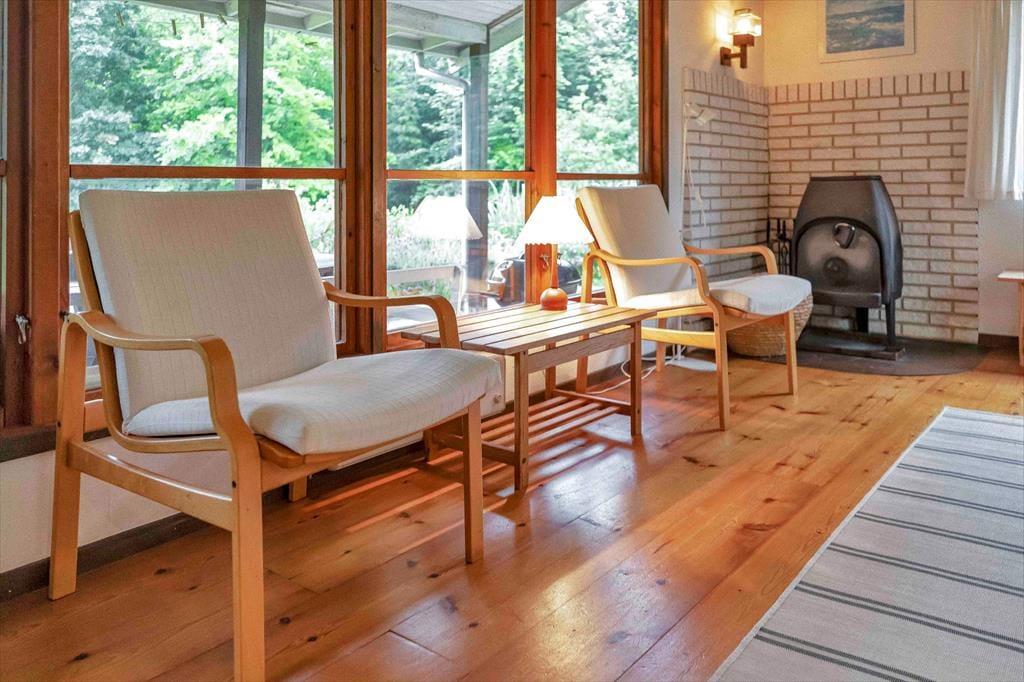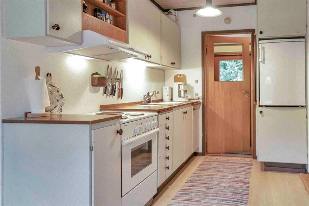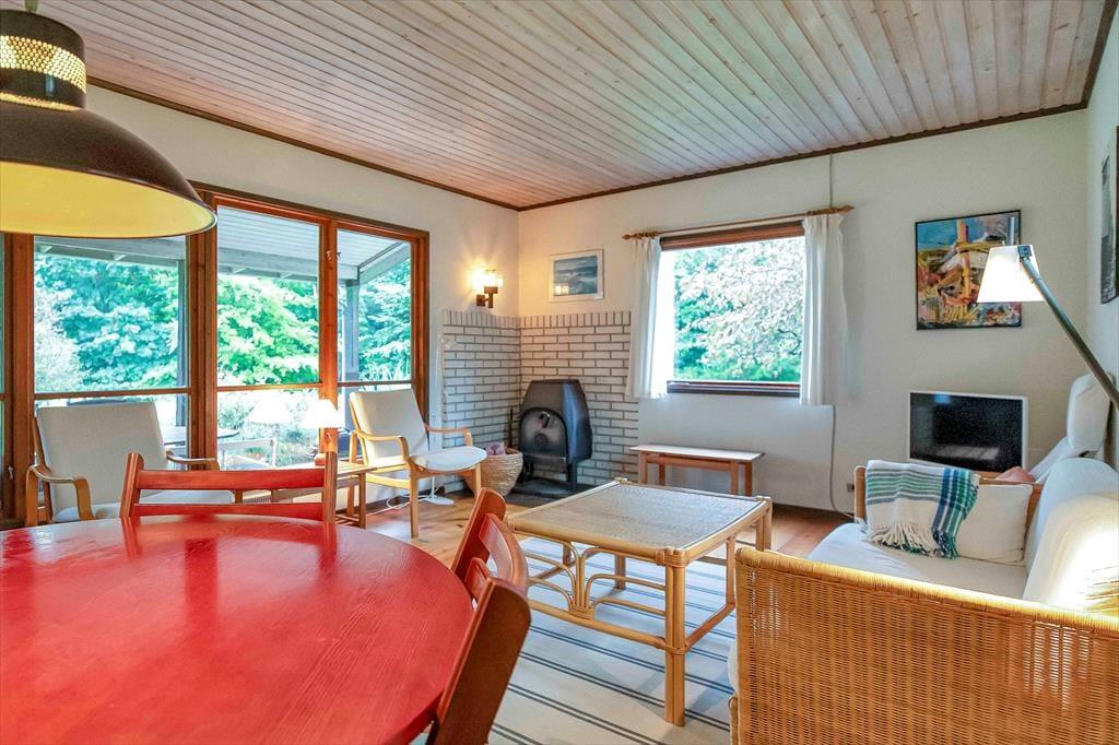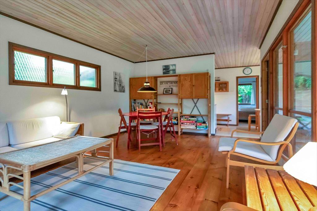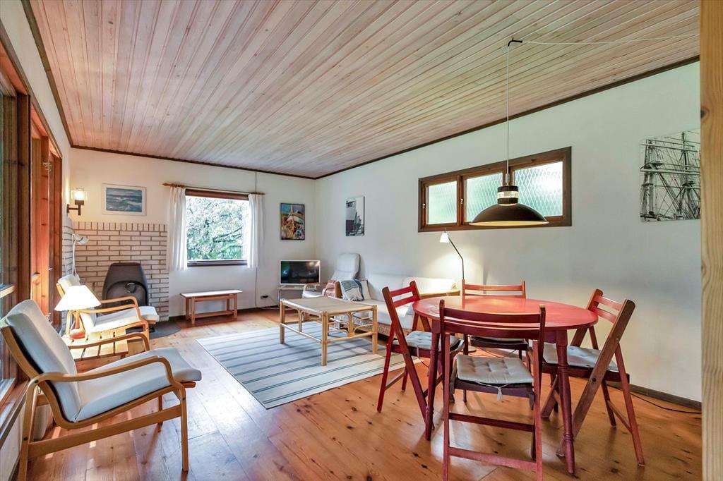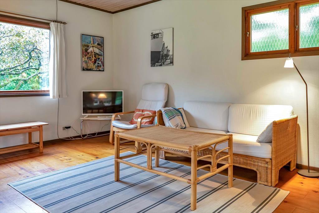 Indendørs mødes du af en hyggelig sommerhusatmosfære med brede plankegulve og trælofter. Sommerhuset er ikke stort men har en rigtig god stemning, en stemning af ferie og afslapning. Stuen som er samlingspunktet i sommerhuset, hvor dagens oplevelser kan drøftes om bordet, har udsigt til haven via det store vinduesparti.