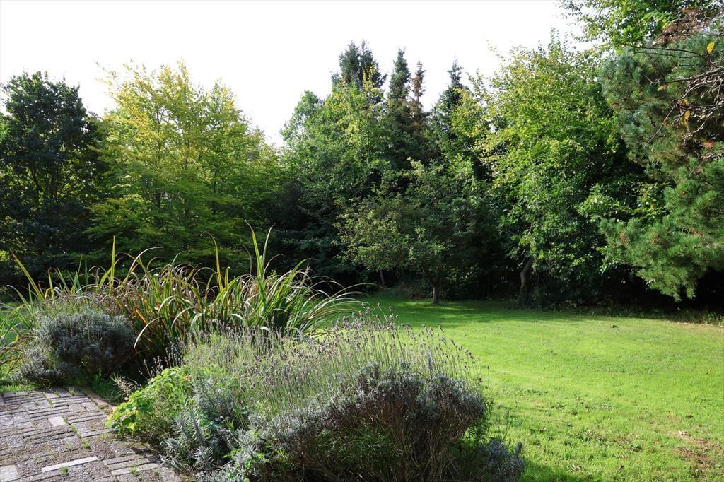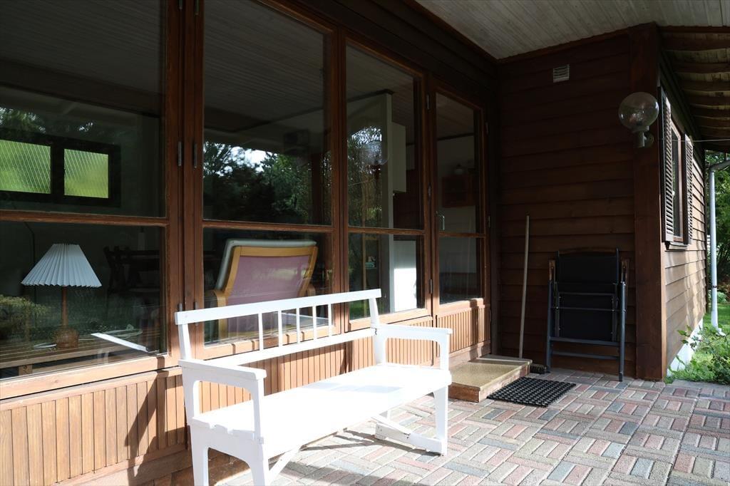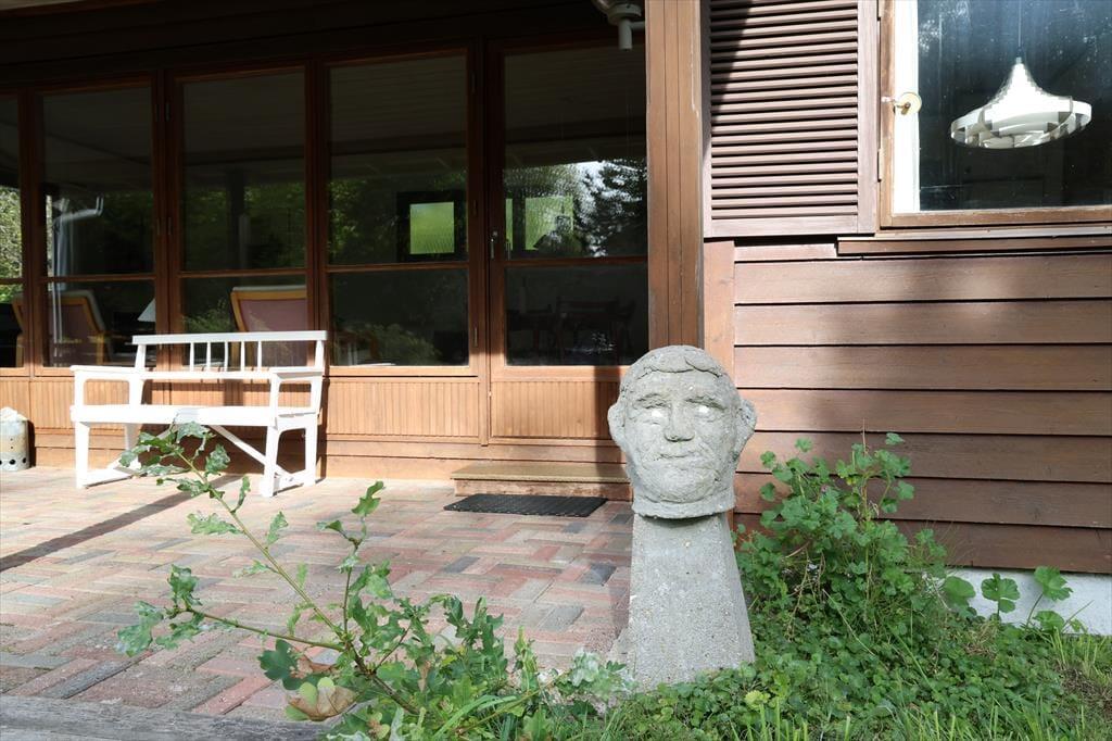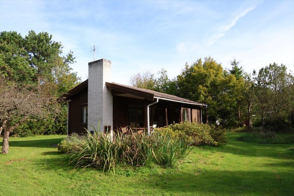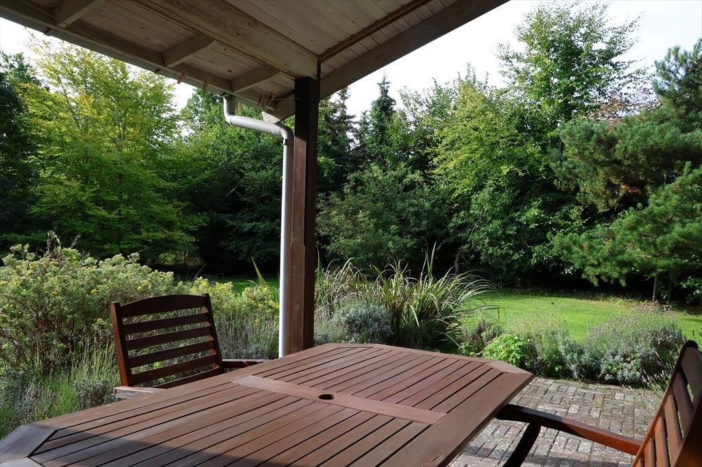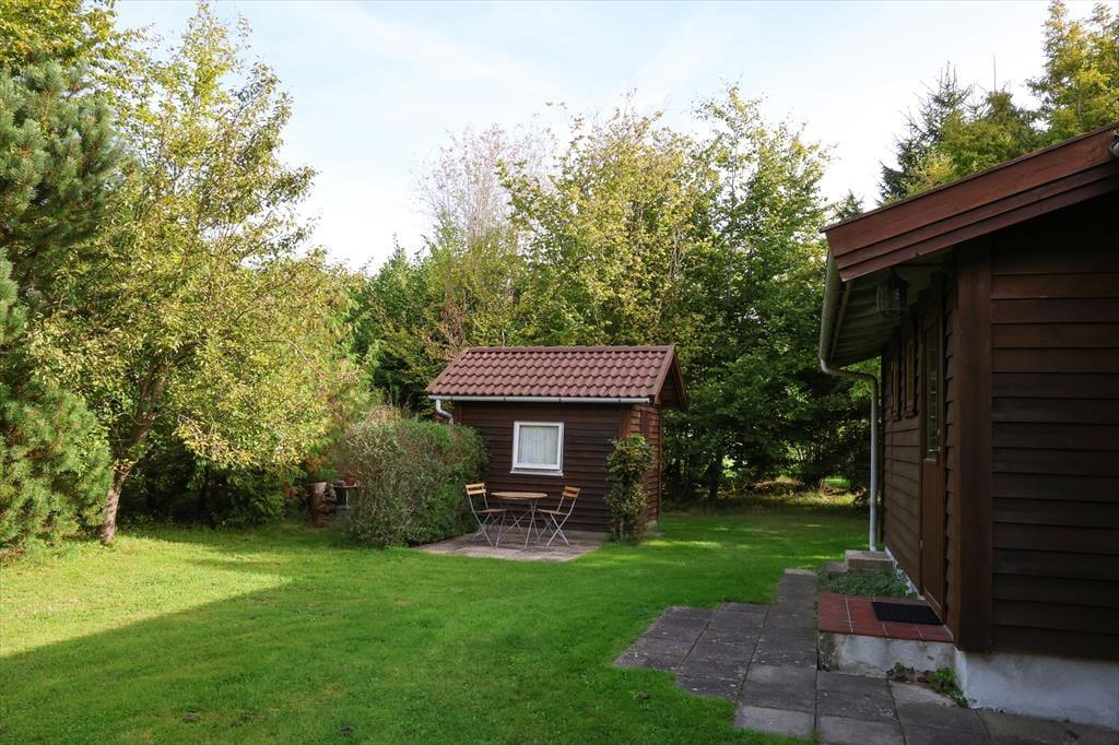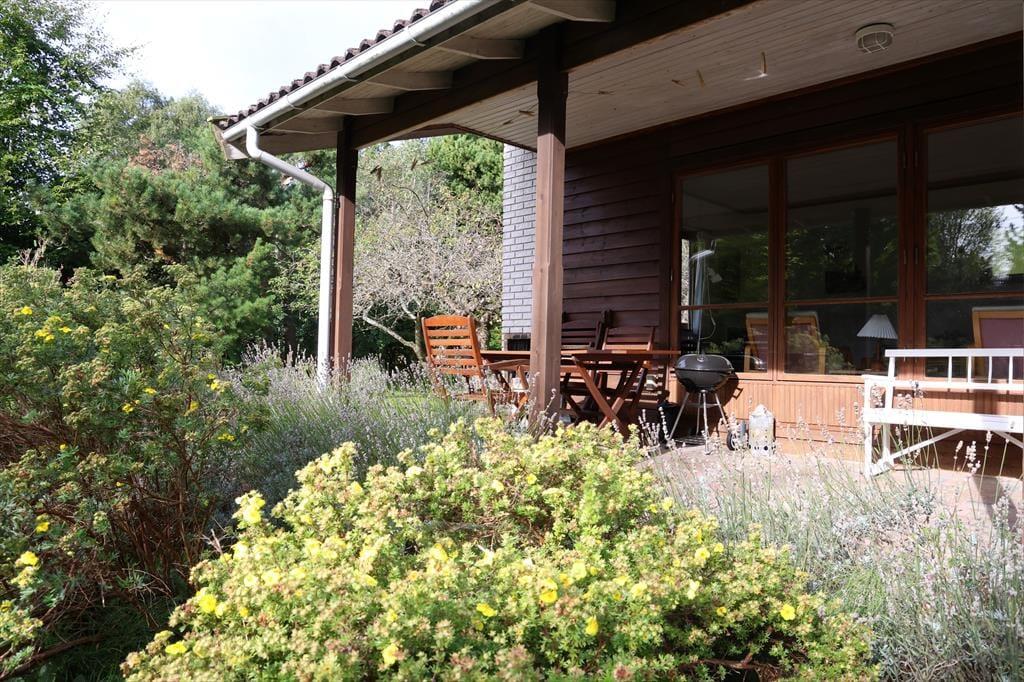 Sommerhuset er beliggende på en stor smuk grund med god randbeplantning. Grunden er smuk med blomster og frugttræer. Der er masser af plads at boltre sig på og nyde en god frokost udendørs og der er altid en god lille hyggekrog at finde læ. Bliver solens stråler for meget eller duggen falder på om aftenen kan der søges ly på den overdækkede terrasse. Her kan der også hygges rundt om bordet imens maden kokkereres på grillen.