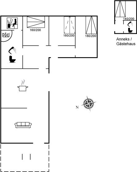 Sommerhuset er stort og rummeligt med god plads til den store familie, og køkkenalrummet i åben forbindelse med stuen samt de gode terrasseområder udgør de naturlige samlingspunkter for hygge og samvær. I selve sommerhuset er der 3 soveværelser med hver 2 sovepladser samt et dejligt stort badeværelse med spa, sauna, bruseniche, gulvvarme og vaskemaskine. I annekset er der 2 sovepladser samt eget badeværelse med bruseniche og gulvvarme. Huset er derfor meget velegnet til 2 familier.