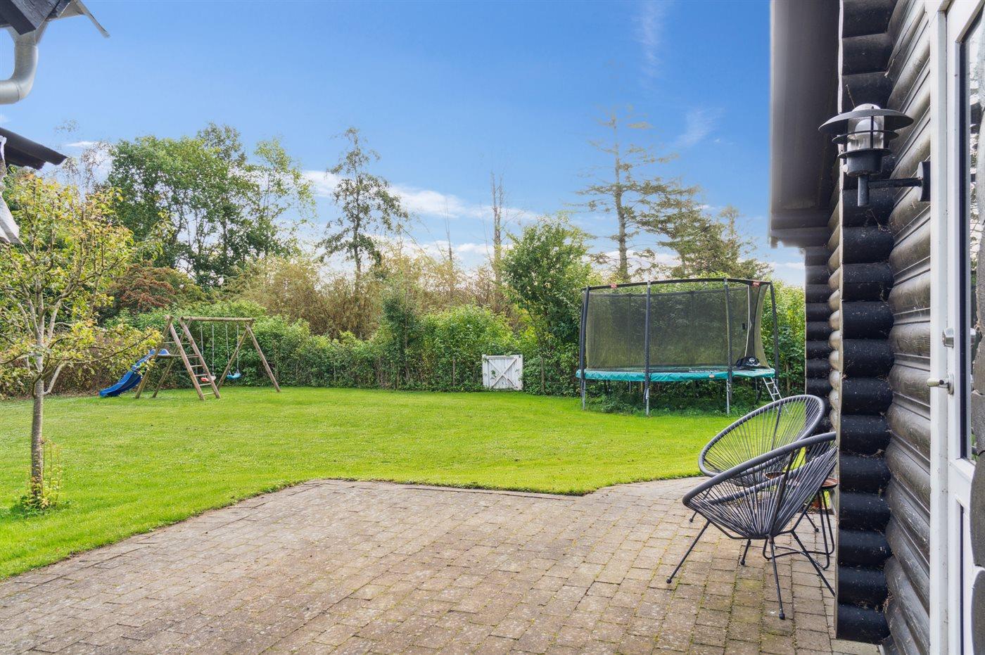 Huset ligger fredeligt på en blind vej og ud til et dejligt naturområde og åbne marker. I den store have er der gynge, trampolin, rutsjebane og legehus og derudover rig mulighed for have- og boldspil.