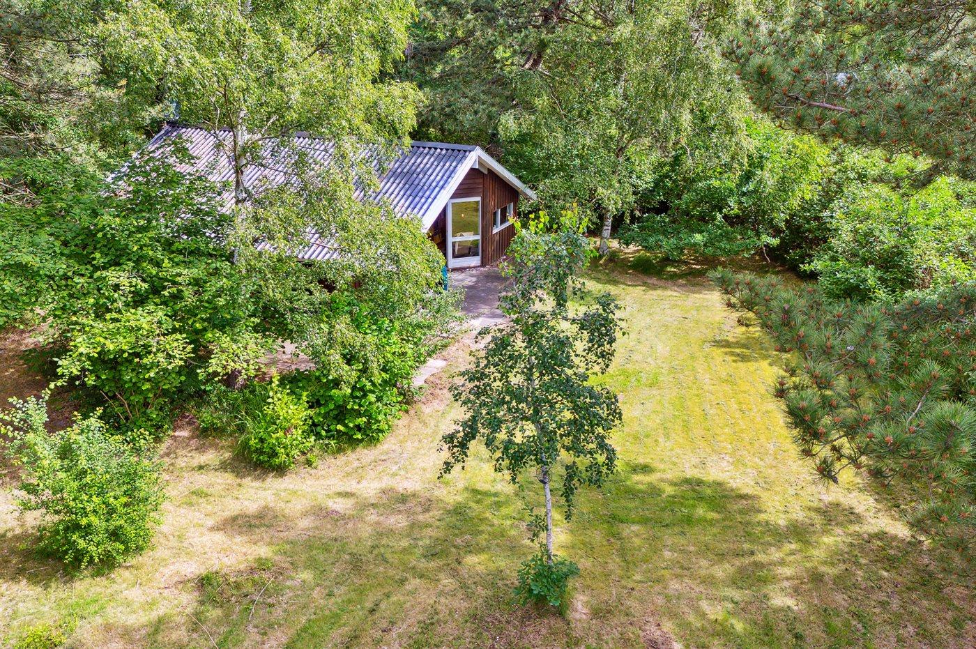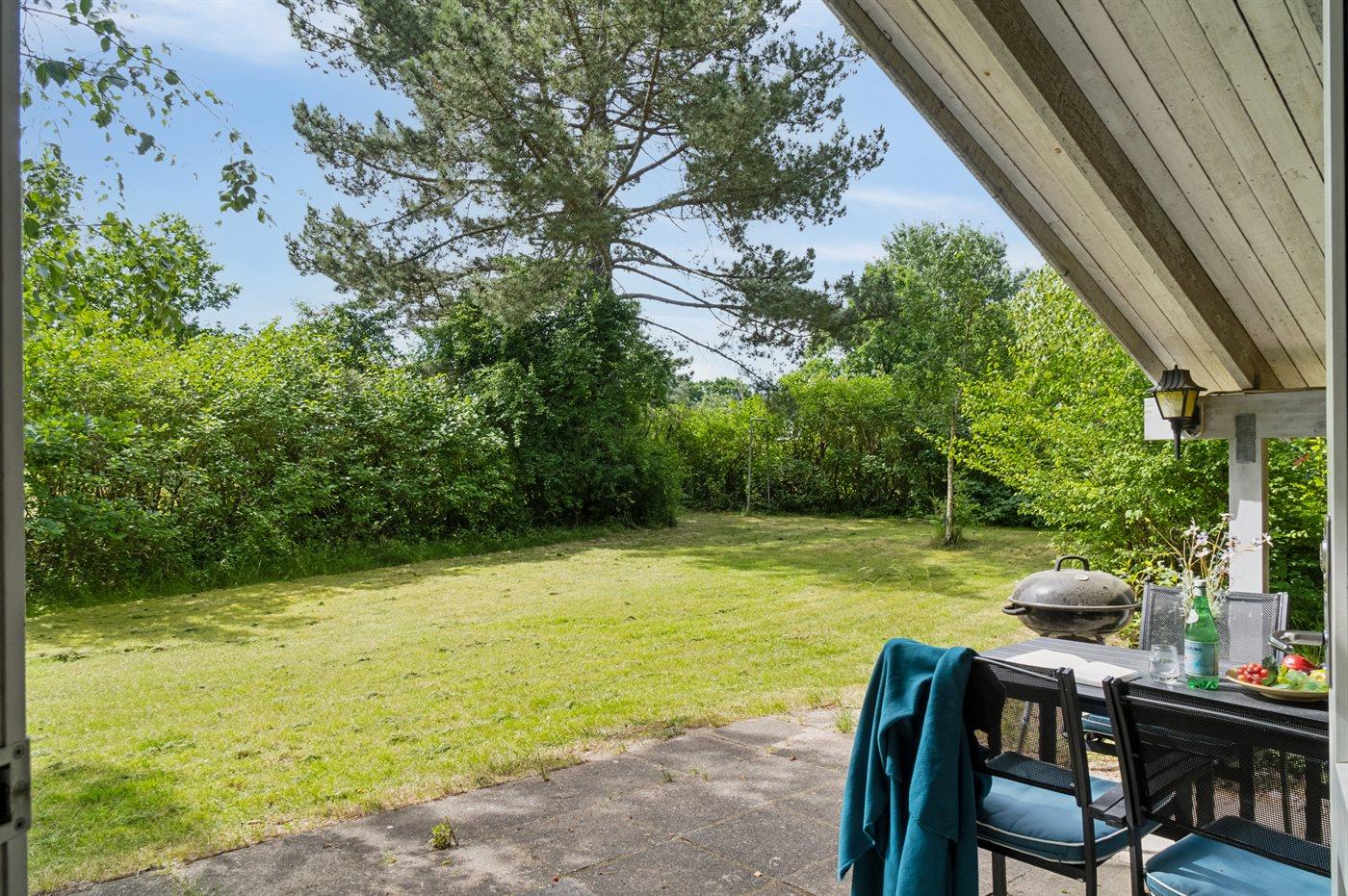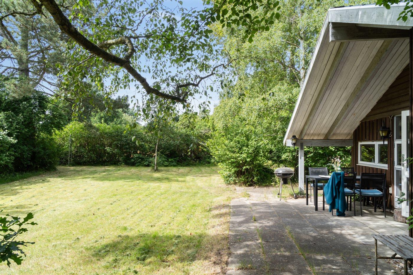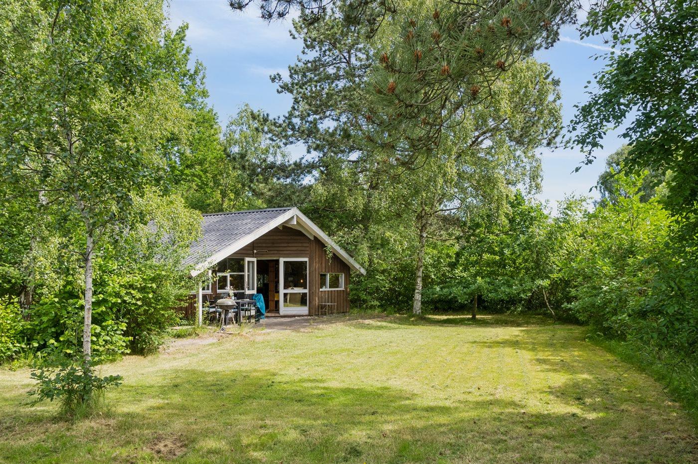 Hyggeligt sommerhus beliggende på en ugenert naturgrund med græsplæne og mange store træer.