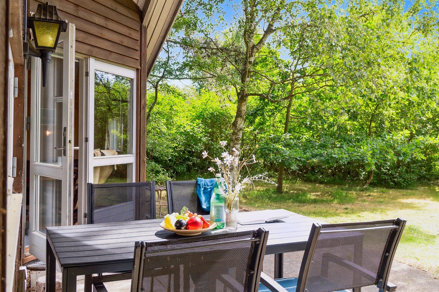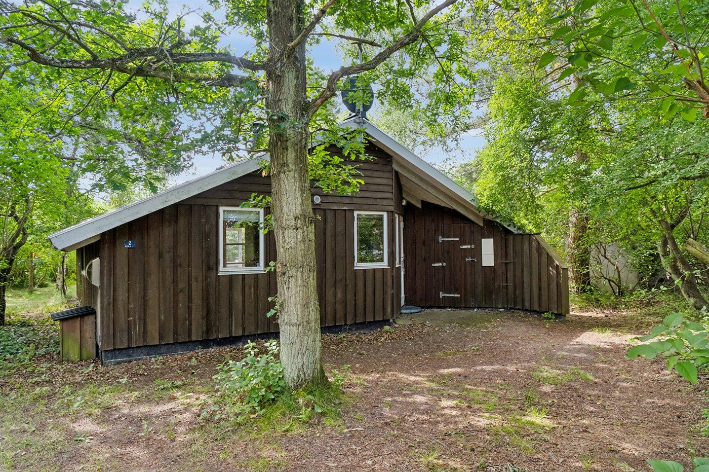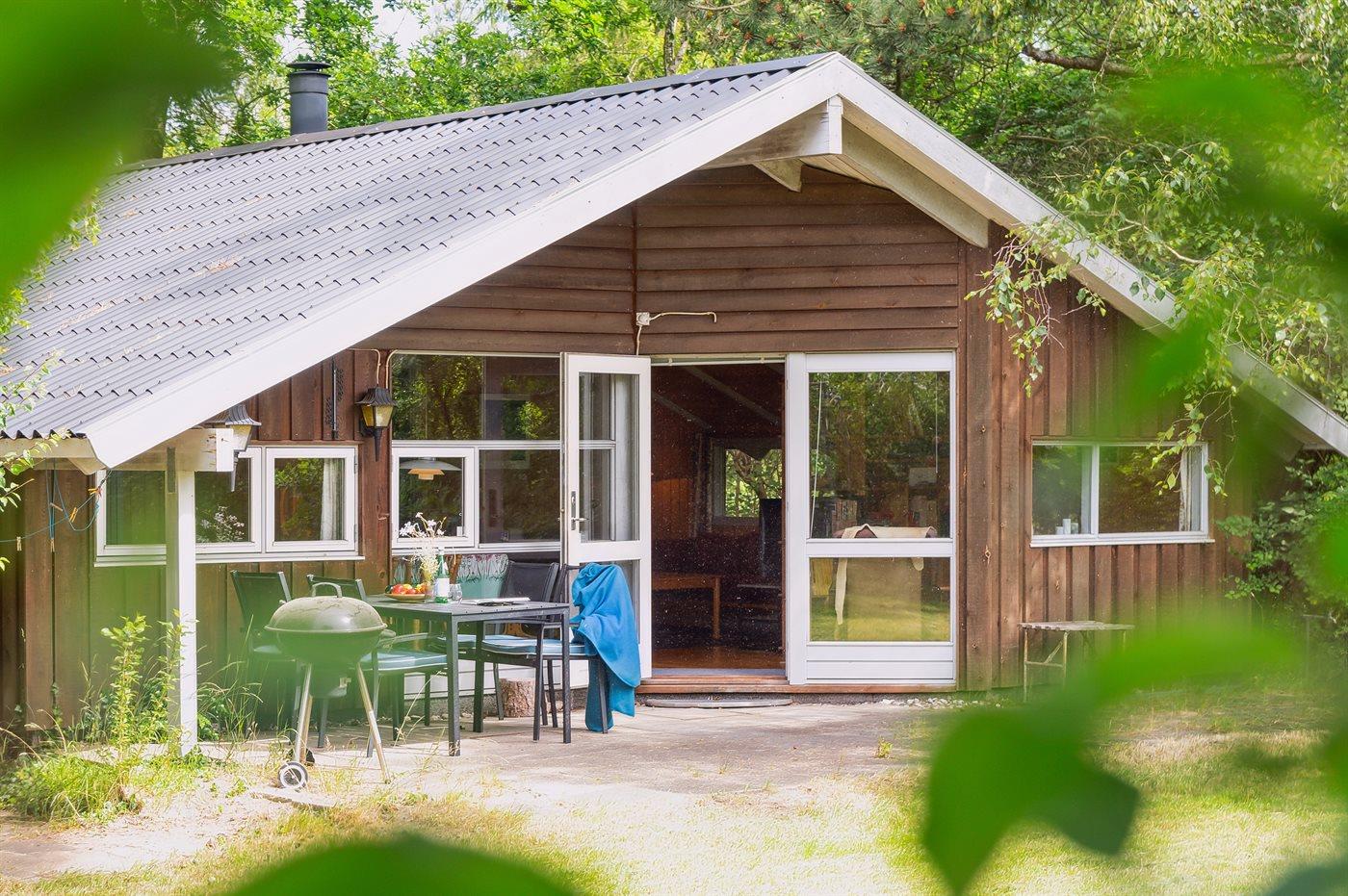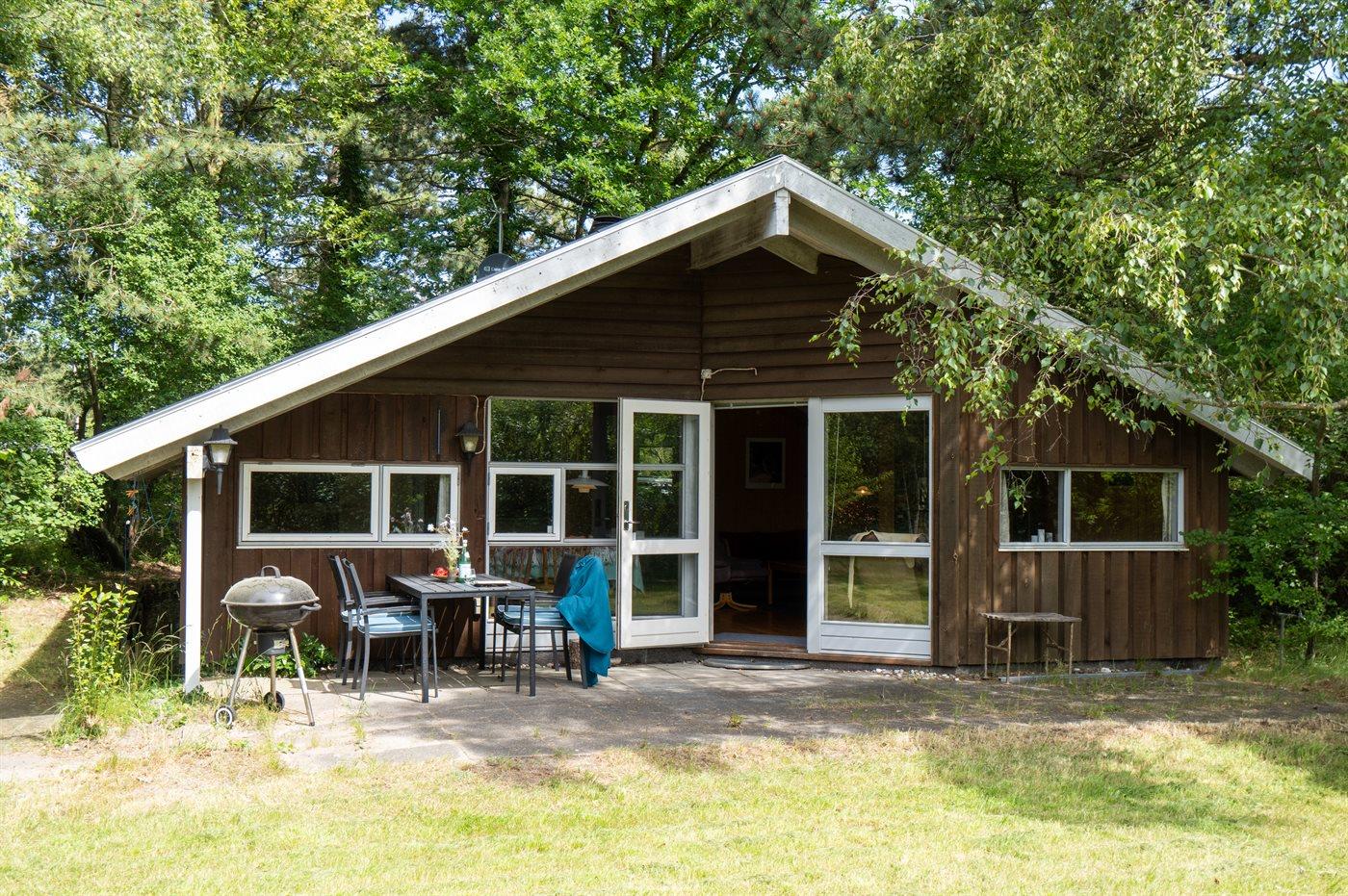 Hyggeligt sommerhus beliggende på en ugenert naturgrund med græsplæne og mange store træer.