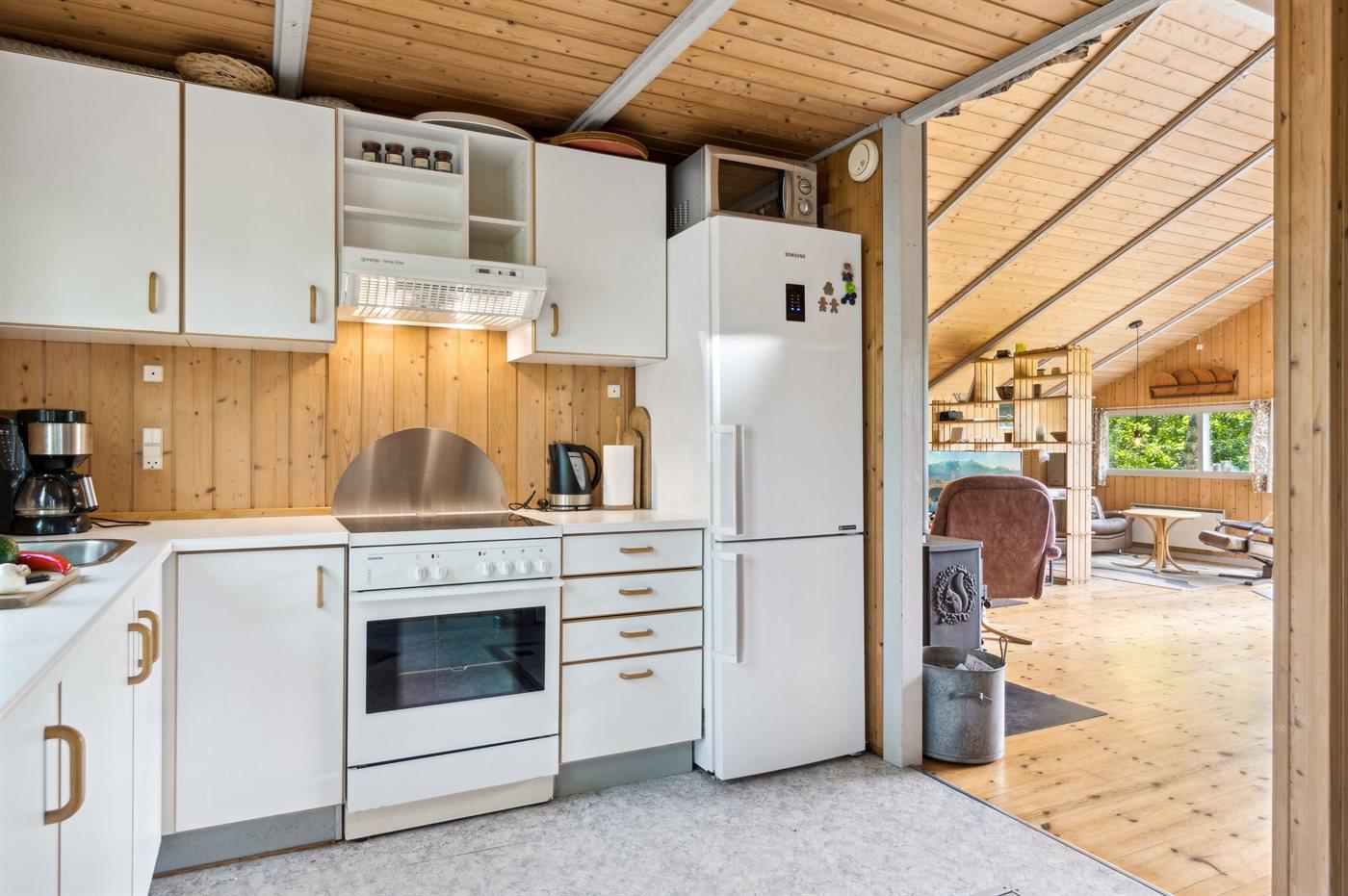 Køkkenet er udstyret med 1 køleskab. Der er 4 keramiske kogeplader, varmluftovn, mikrobølgeovn.