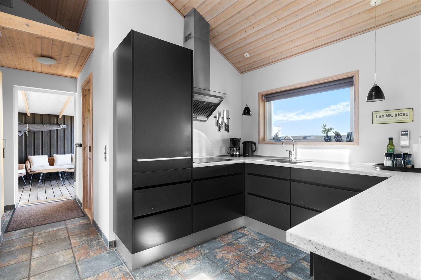 Køkkenet er udstyret med 1 køleskab. Der er 4 keramiske kogeplader, varmluftovn, mikrobølgeovn samt opvaskemaskine.