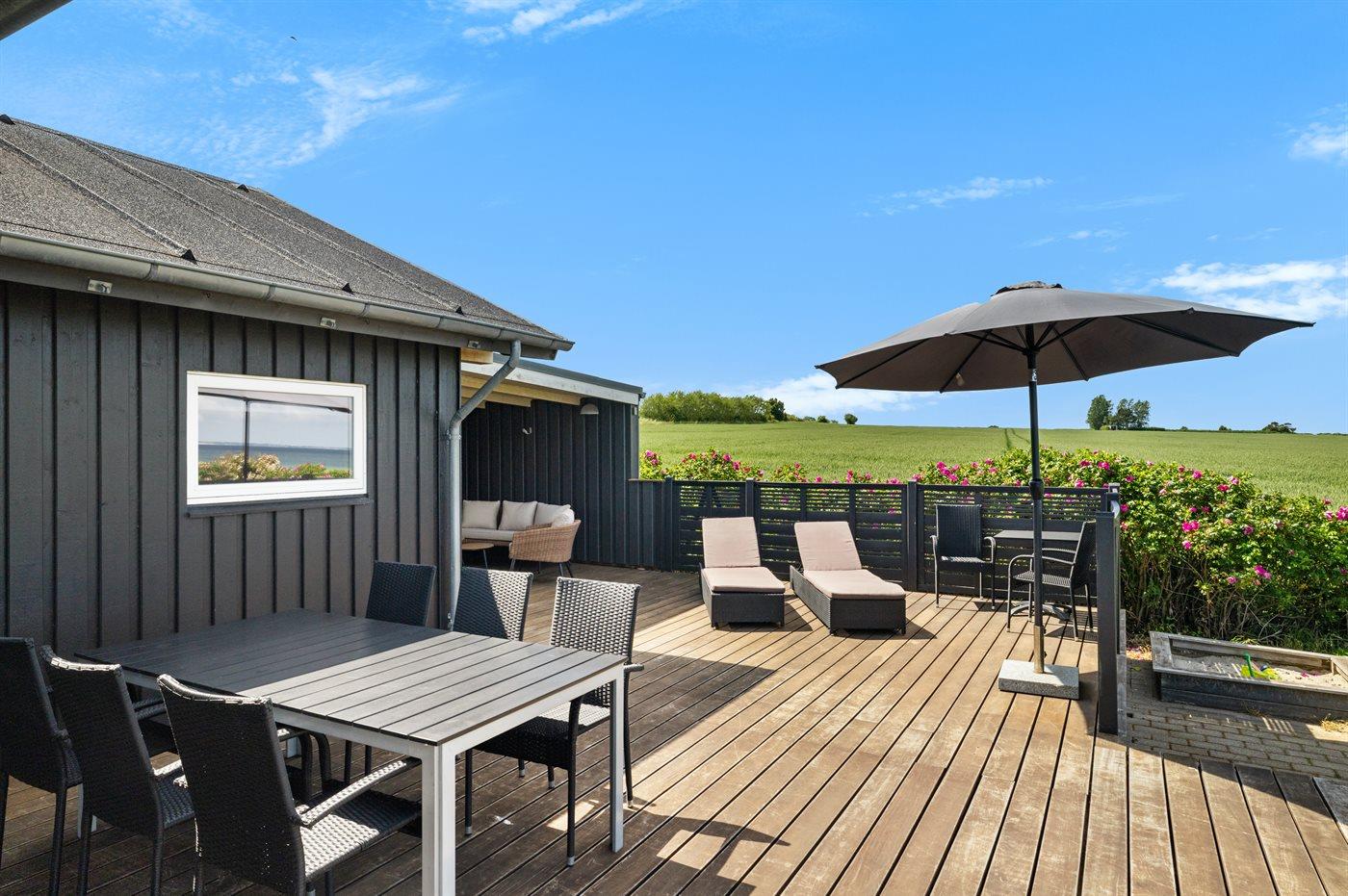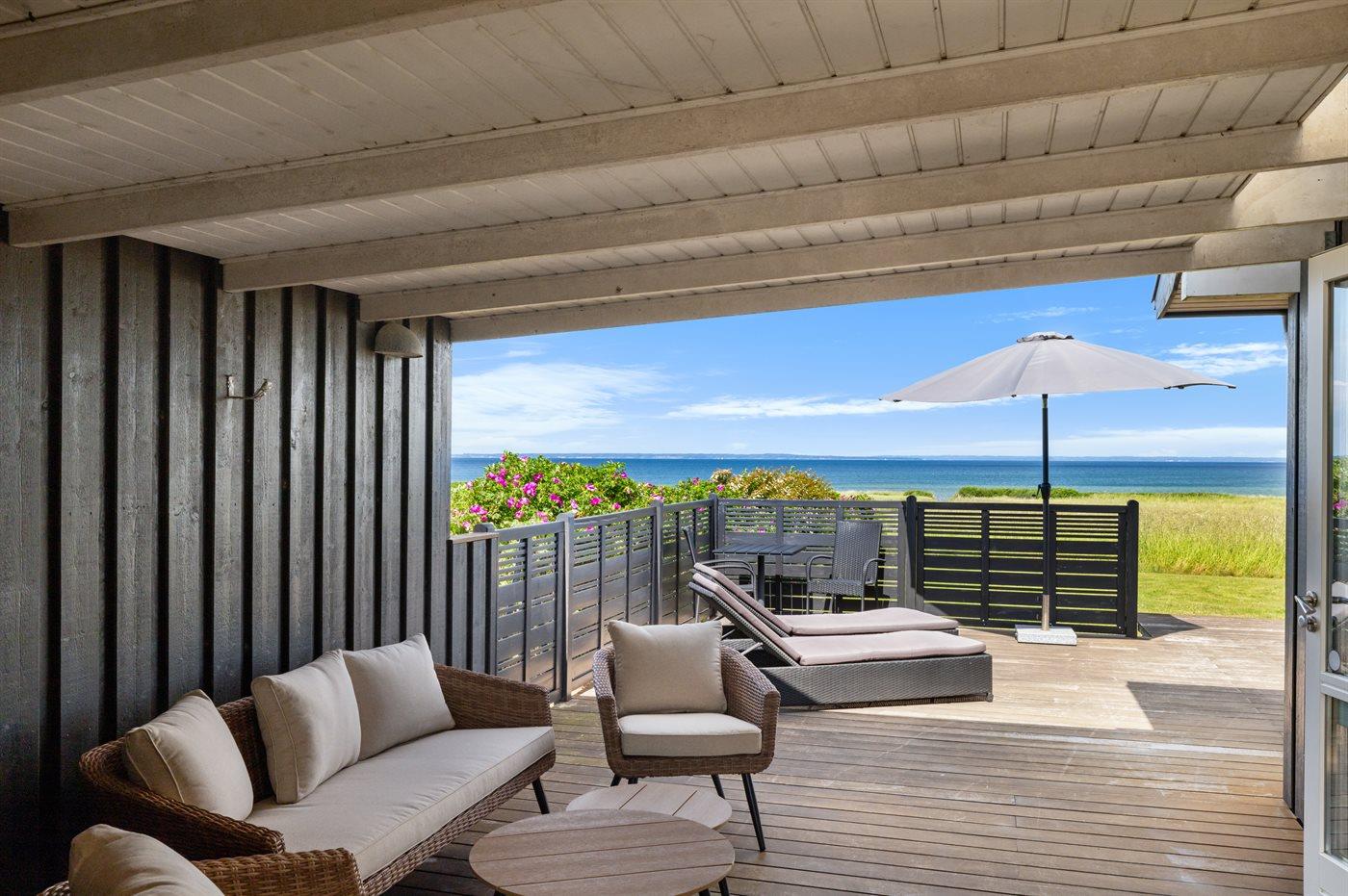 Fra både huset og terrasseområdet er der en skøn udsigt ud over vandet og det grønne område.