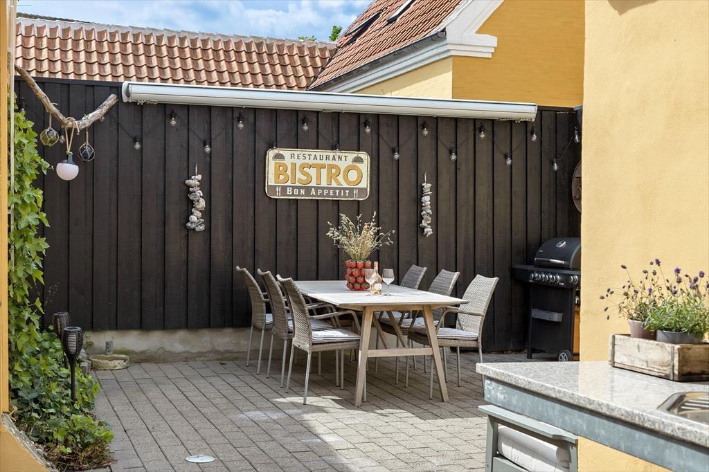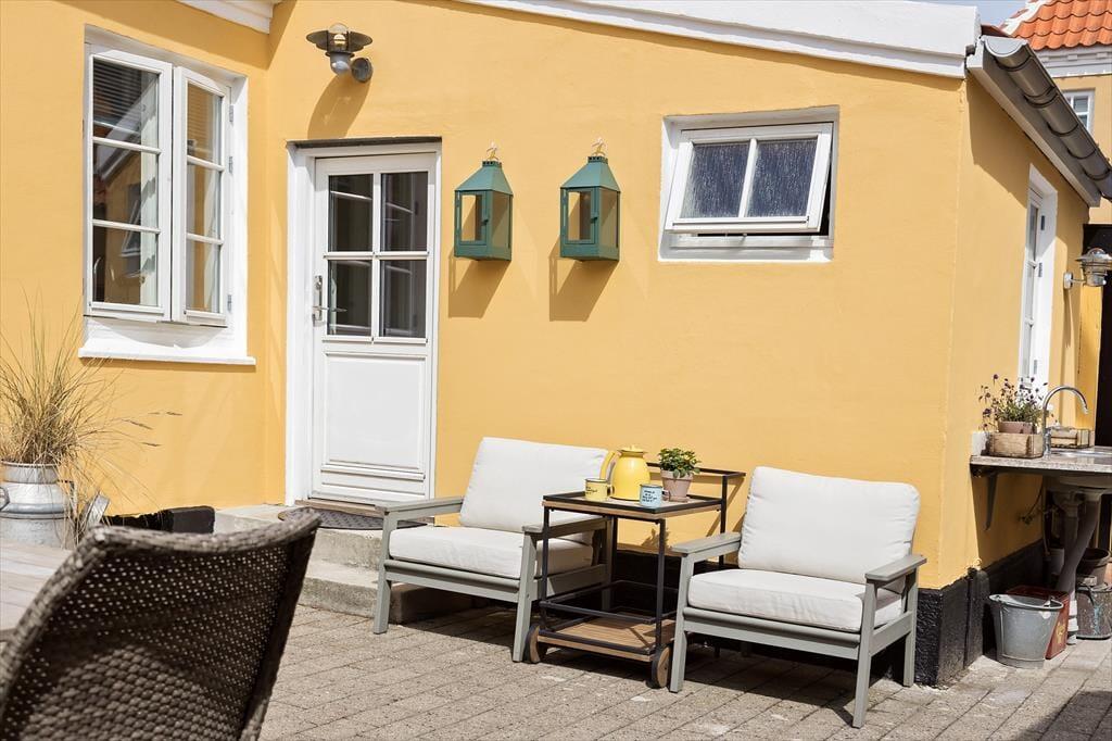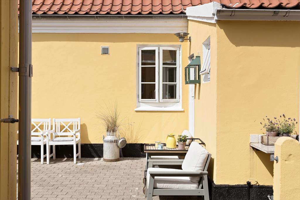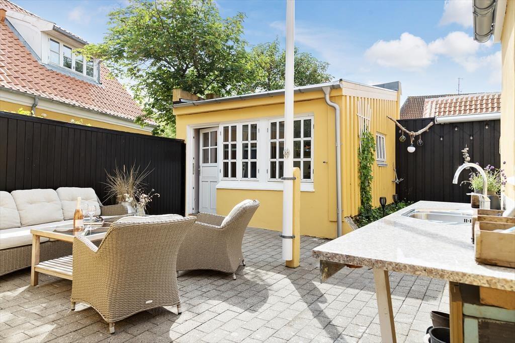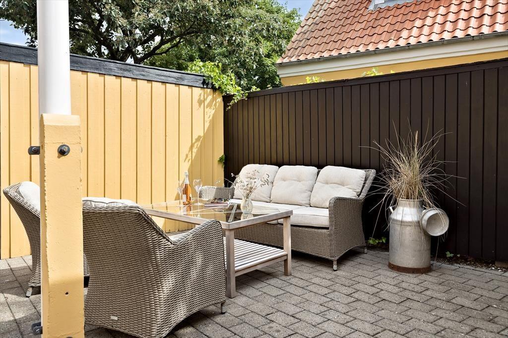 Udenfor finder du en fredelig og indbydende gårdhave, hvor du kan nyde det gode vejr i helt ugenerede omgivelser. Her er der god plads til at spise morgenmad under åben himmel, tage eftermiddagskaffen med i en solrig krog eller grille aftensmaden og nyde de lune sommeraftener i selskab med familie og venner. Gårdhaven er delvist afskærmet, og med blomsterkrukker, havemøbler og plads til afslapning bliver det let at føle sig hjemme her. Hunden vil også elske at være med i de rolige omgivelser, hvor der ikke er langt til hverken snuseture i byens gader eller leg på stranden. Det er det perfekte sted at lade feriedagene flyde sammen i et roligt tempo – og det kræver ikke mange skridt, før du står midt i byens liv igen.