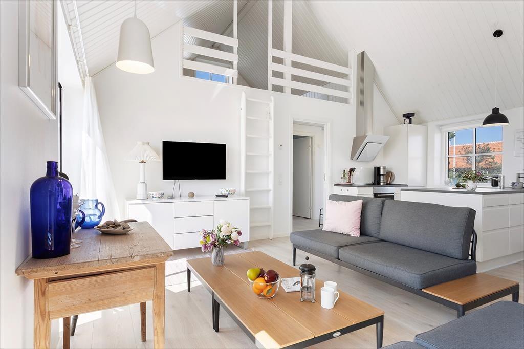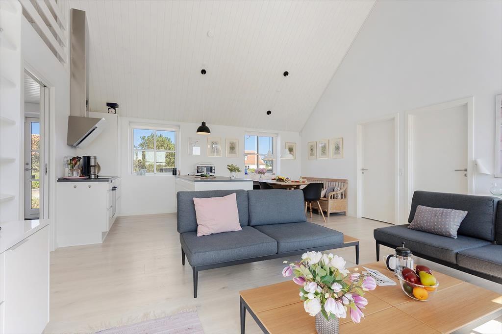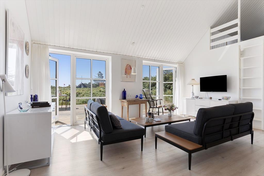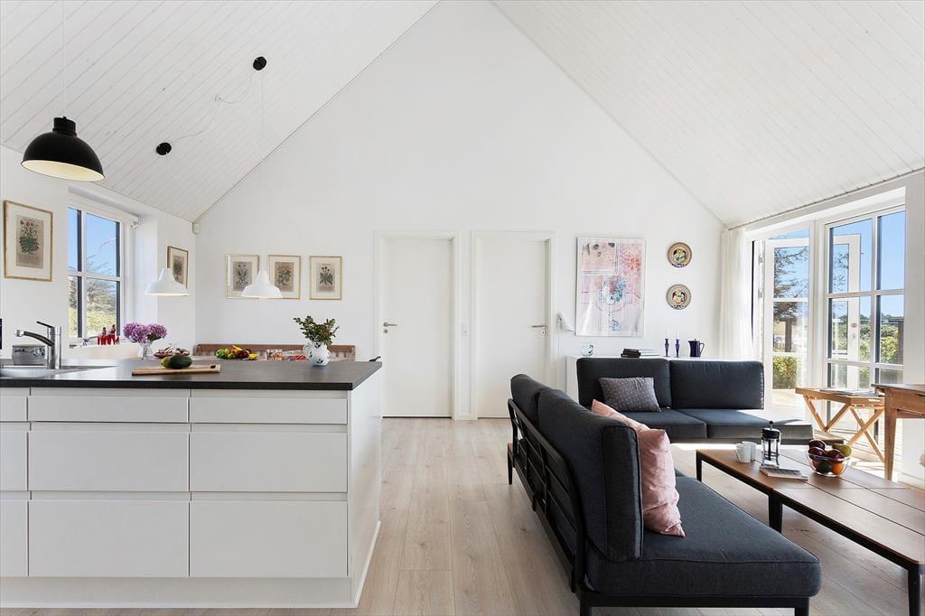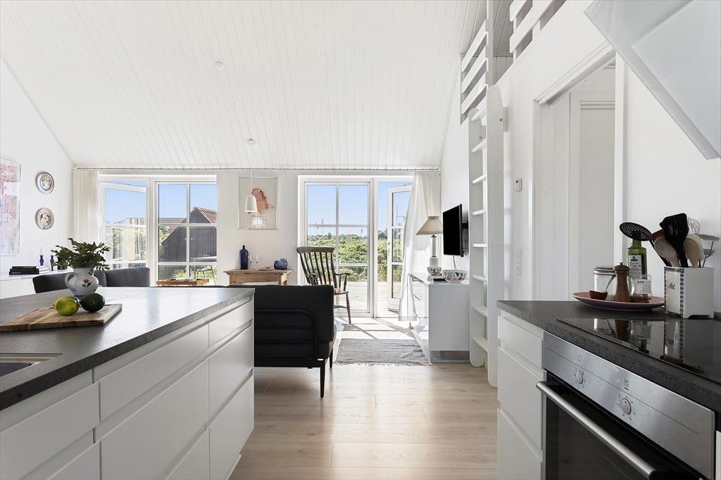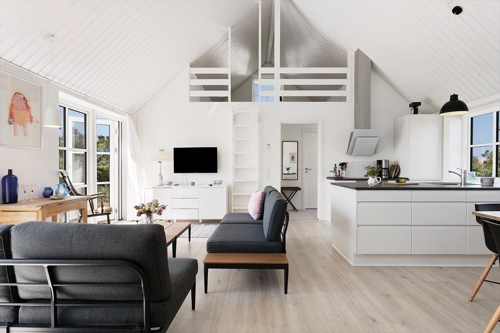 Indenfor venter en bolig med en særlig rolig og indbydende stemning. Den åbne indretning og de høje lofter giver en dejlig fornemmelse af rummelighed, og fra opholdsrummet er der direkte udgang til terrassen, så udeliv og indeliv let flyder sammen. Her kan hele familien samles til måltider omkring det åbne køkken, hvor feriens madlavning kan foregå i takt med samtaler og latter fra stuen. Når dagen går på hæld, og solen sender sine sidste gyldne stråler ind gennem vinduerne, bliver stuen et naturligt samlingspunkt – perfekt til brætspil, gode bøger eller bare ren afslapning. Huset rummer tre store værelser, som gør det let at finde ro til en god nattesøvn, mens hemsen skaber en hyggelig ekstra dimension – oplagt som lege- eller læsehjørne for familiens yngste. Her er der tænkt over detaljerne, og det mærkes, at huset er bygget med fokus på både funktion og æstetik.