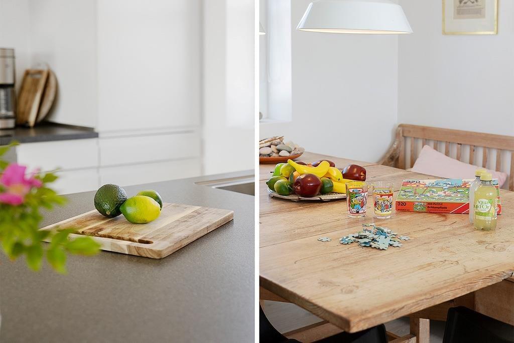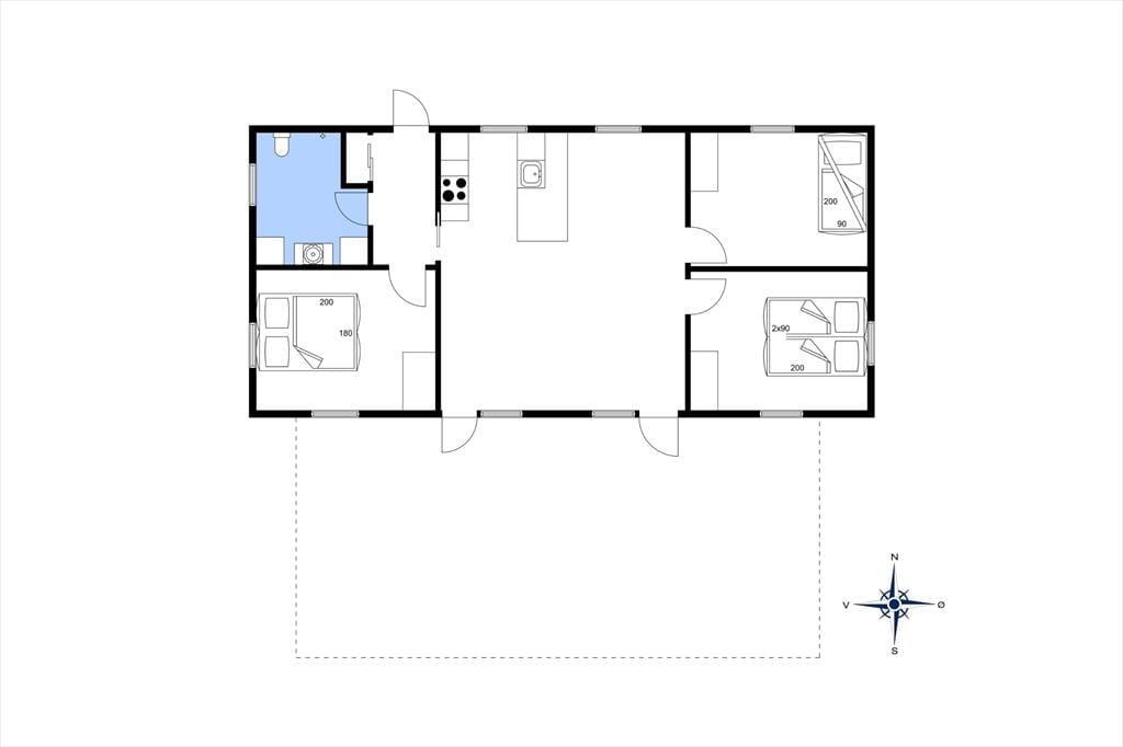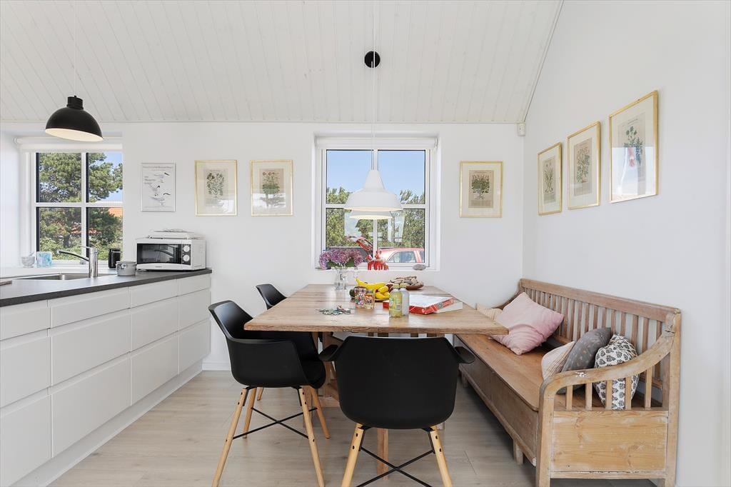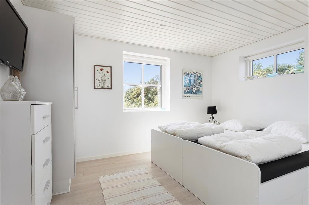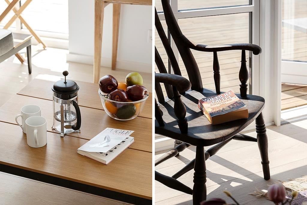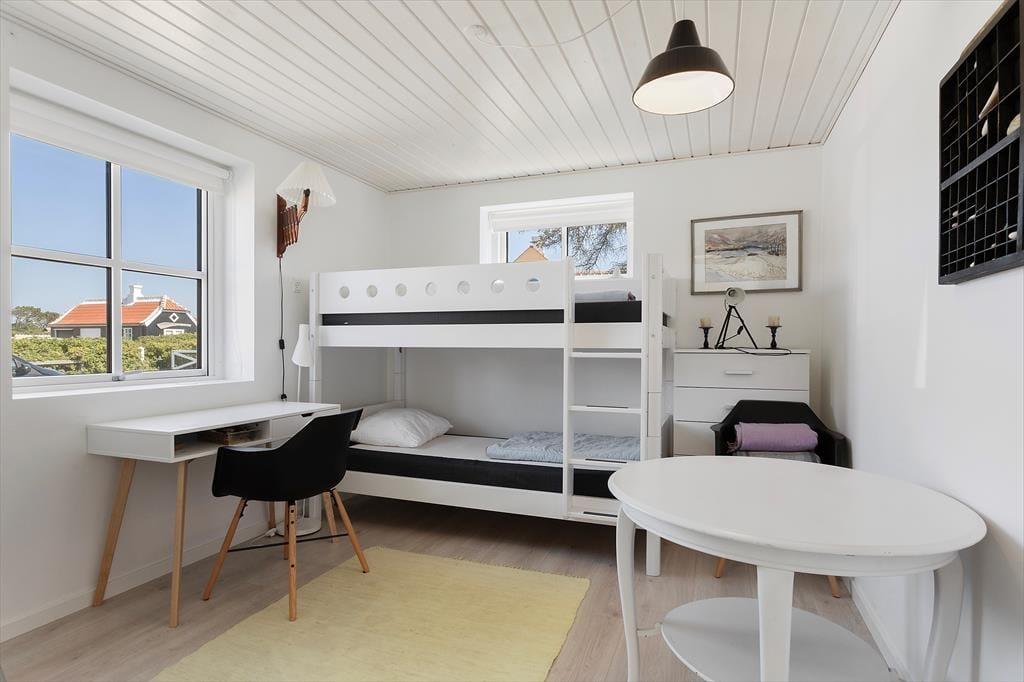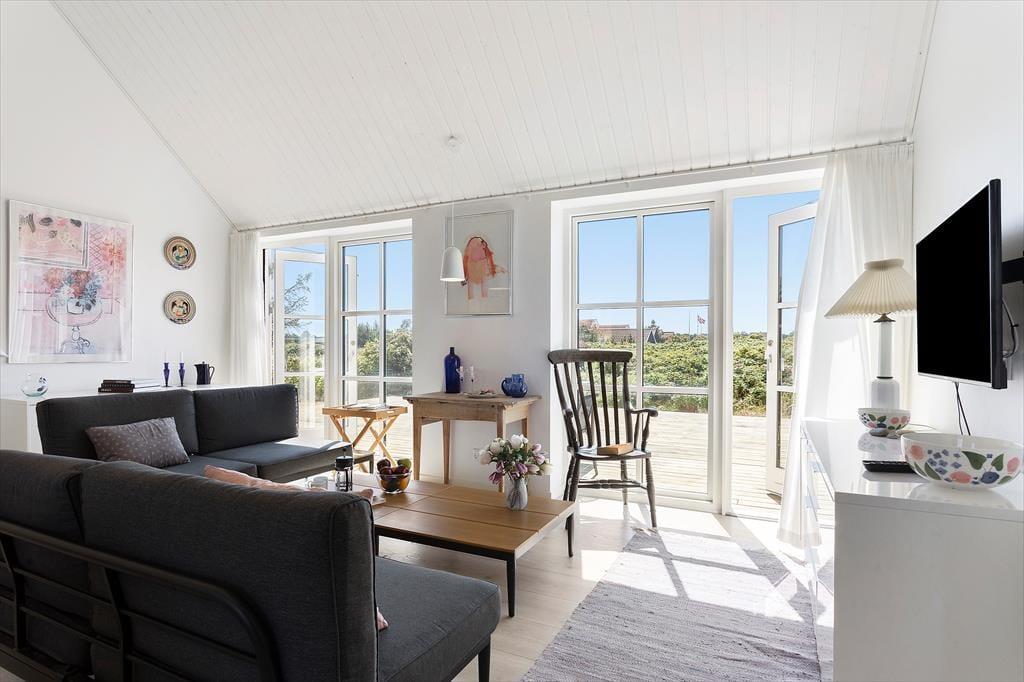Indenfor venter en bolig med en særlig rolig og indbydende stemning. Den åbne indretning og de høje lofter giver en dejlig fornemmelse af rummelighed, og fra opholdsrummet er der direkte udgang til terrassen, så udeliv og indeliv let flyder sammen. Her kan hele familien samles til måltider omkring det åbne køkken, hvor feriens madlavning kan foregå i takt med samtaler og latter fra stuen. Når dagen går på hæld, og solen sender sine sidste gyldne stråler ind gennem vinduerne, bliver stuen et naturligt samlingspunkt – perfekt til brætspil, gode bøger eller bare ren afslapning. Huset rummer tre store værelser, som gør det let at finde ro til en god nattesøvn, mens hemsen skaber en hyggelig ekstra dimension – oplagt som lege- eller læsehjørne for familiens yngste. Her er der tænkt over detaljerne, og det mærkes, at huset er bygget med fokus på både funktion og æstetik.