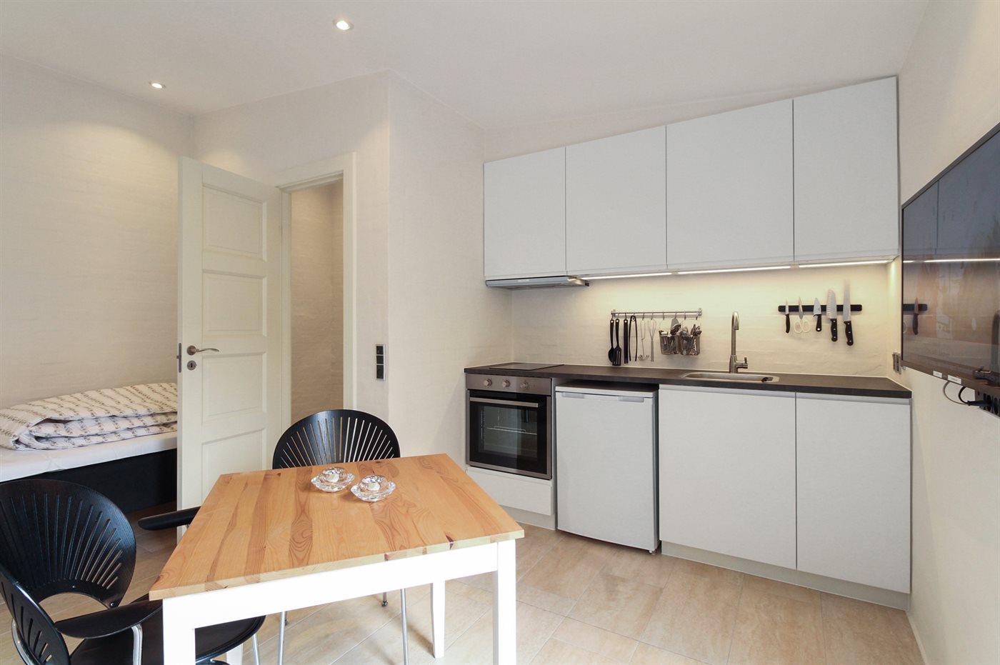 Køkkenet er udstyret med 1 køleskab. Der er 2 keramiske kogeplader, varmluftovn.