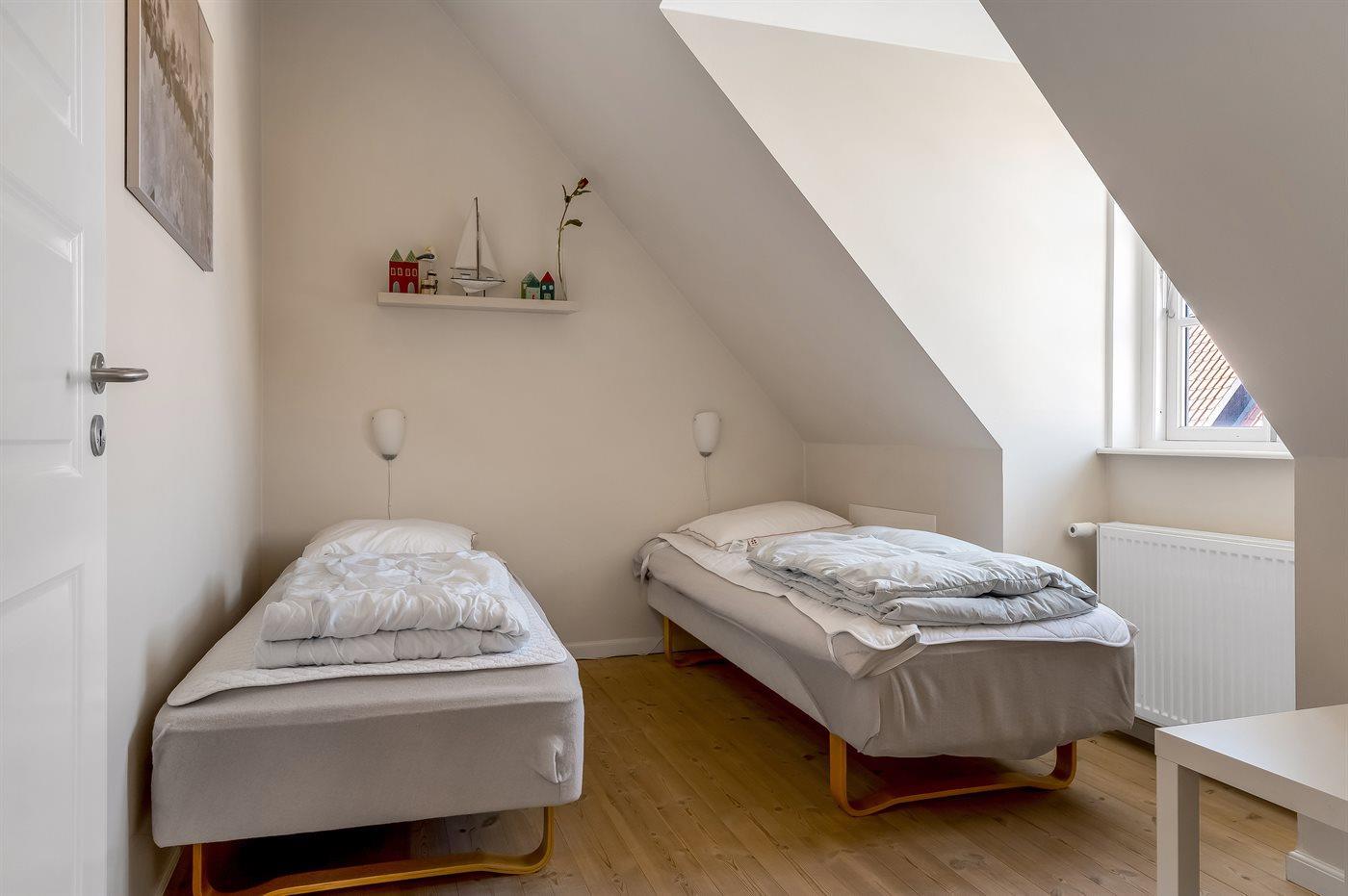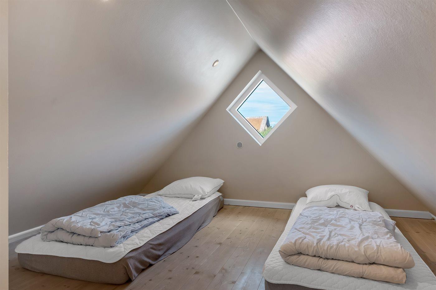 Der er i alt 3 soveværelser. Sovepladserne fordeler sig på: 6 sovepladser i enkeltsenge. 2 sovepladser på madrasser. 2 af disse sovepladser befinder sig på husets hems. Derudover er der 1 stk. barneseng.