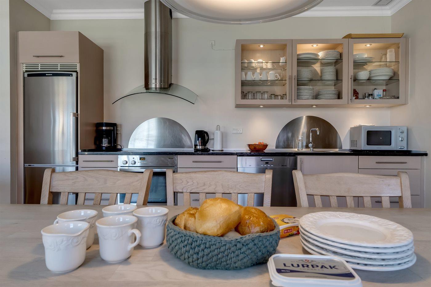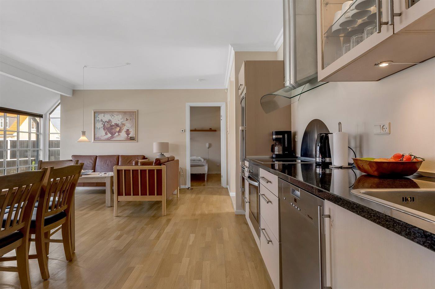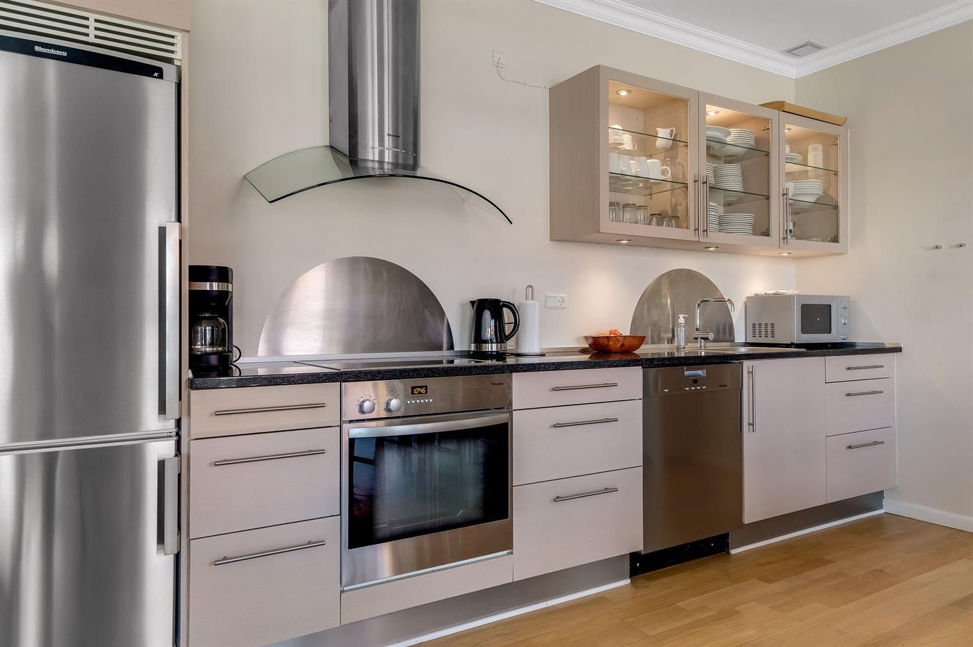 Køkkenet er udstyret med 1 køleskab. Der er 4 keramiske kogeplader, varmluftovn, mikrobølgeovn samt opvaskemaskine Der er gulvvarme i køkkenet.