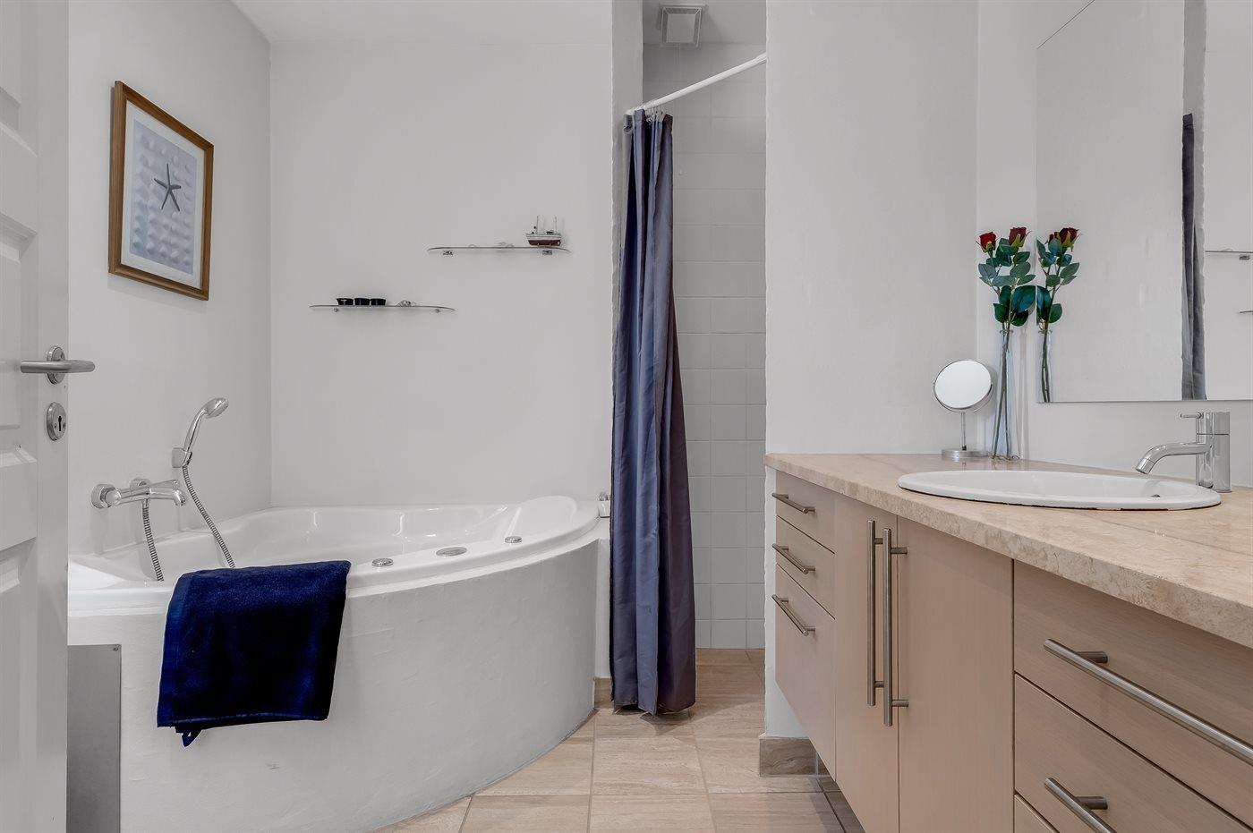 Der er 2 badeværelser med bruseniche og 2 toiletter. Der er gulvvarme på 1 badeværelse.