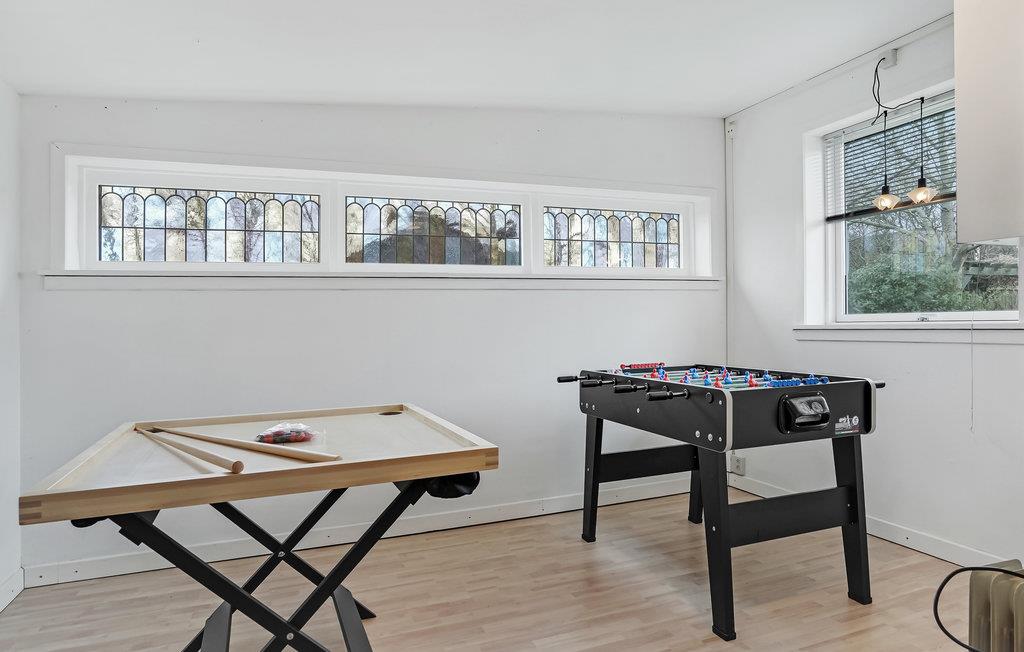 Velkommen til Skagen og en optimal beliggenhed, hvis I vil fylde dagene med strandliv og kulturoplevelser. Huset giver jer gode rammer til at slappe af og samles efter en lang dag på farten. Opholdsstuen er lyst og moderne indrettet, og her kan I fylde aftentimerne med hyggelige aktiviteter. Snup et hurtigt spil bordfodbold, hvis I trænger til at komme op at stå, og sæt jer til rette med brætspil og bøger i udestuen, mens ilden knitrer i brændeovnen.