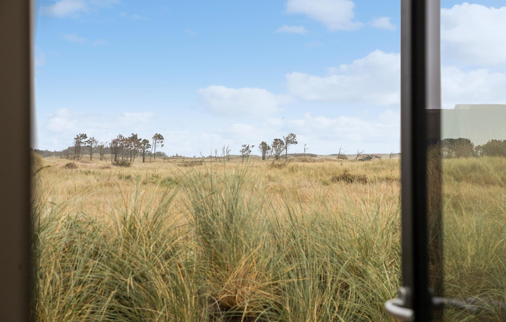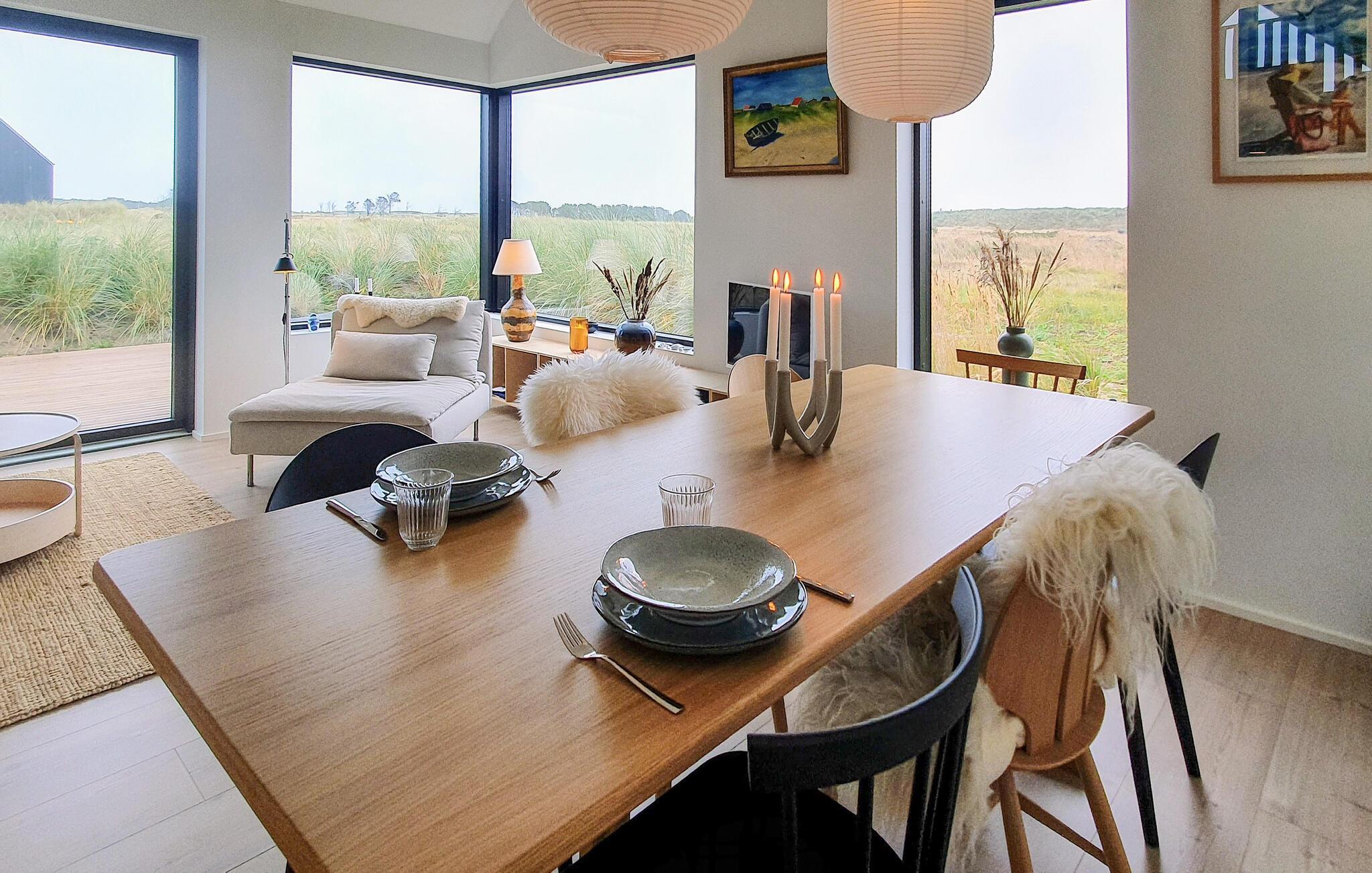 Arkitekttegnet sommerhus i Skagen med udsigt til klitter og Vesterhavet, perfekt til afslapning og naturoplevelser.