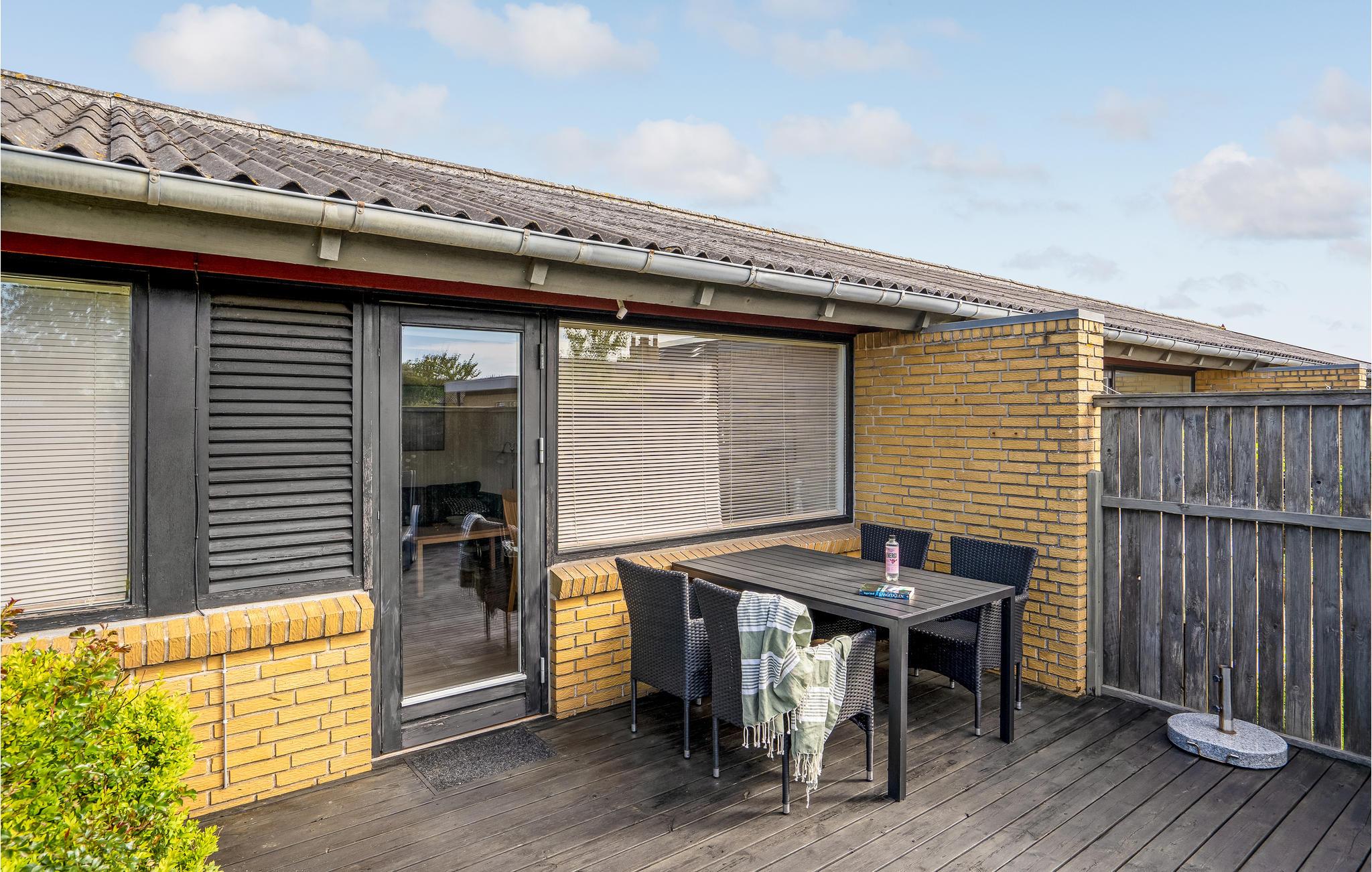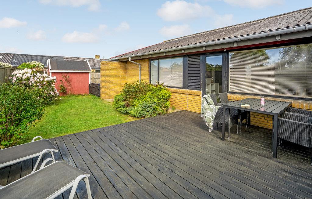 Ferieboligen fremstår med flotte, rengøringsvenlige og lyse træ- og klinkegulve. Stuen er flot udstyret med moderne møbler, 55 tommers Smart-TV, ligesom køkkenet er udstyret med køkkengrej i god kvalitet. Fra stuen er der udgang til en lille, ugeneret og indhegnet have med en stor træterrasse, hvor I kan nyde solen det meste af dagen. Fra haven er der desuden adgang til et fælles græsareal, hvor børn kan lege og spille bold.