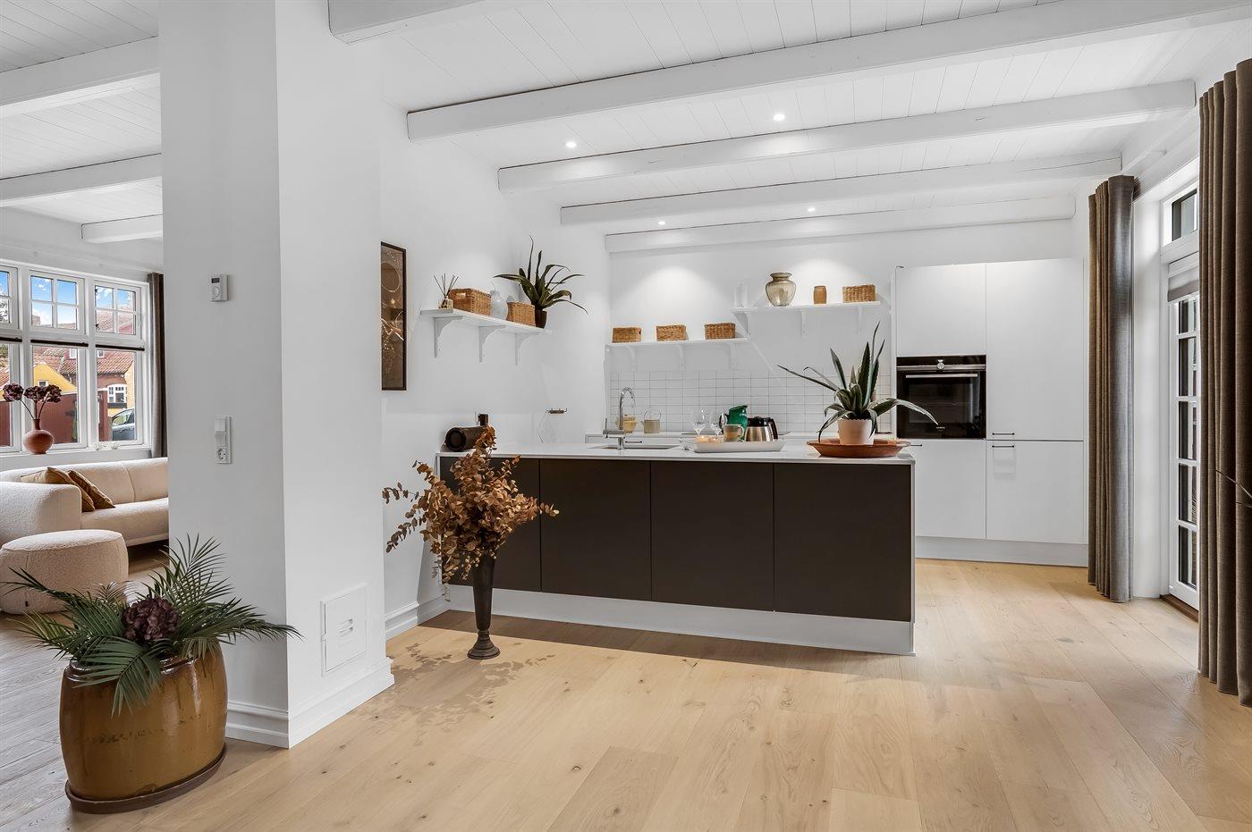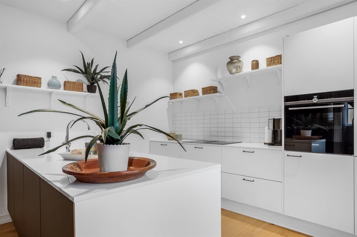 Køkkenet er udstyret med 1 køleskab. Der er 4 induktionskogeplader, varmluftovn samt opvaskemaskine.