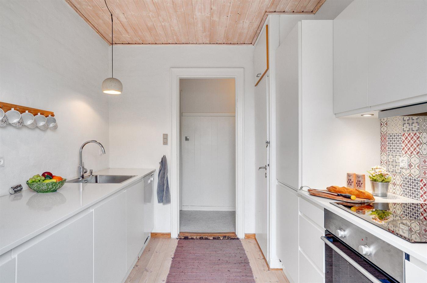 Køkkenet er udstyret med 1 køleskab. Der er 4 keramiske kogeplader, varmluftovn samt opvaskemaskine.