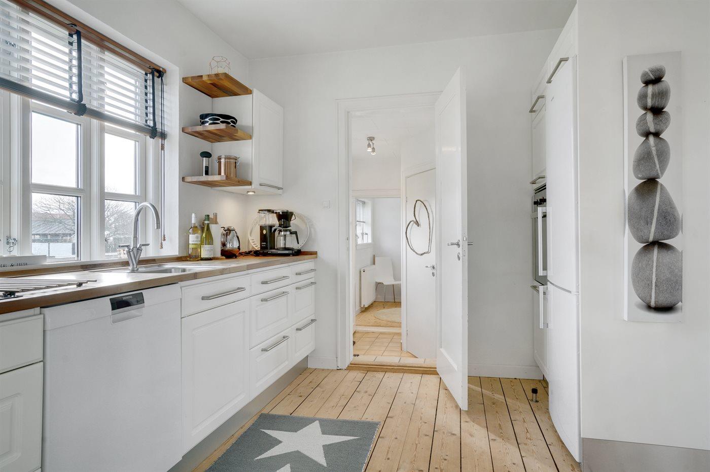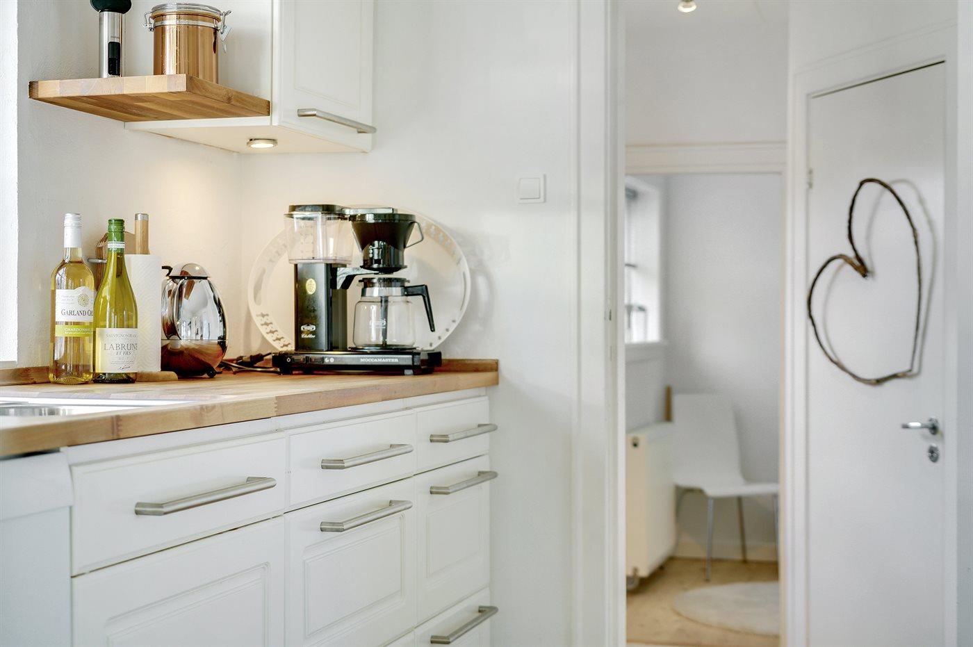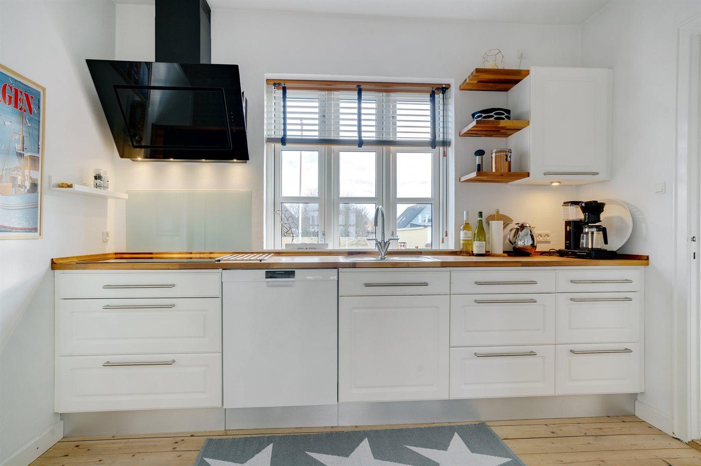 Køkkenet er udstyret med 1 køleskab. Der er 4 induktionskogeplader, varmluftovn, mikrobølgeovn samt opvaskemaskine.