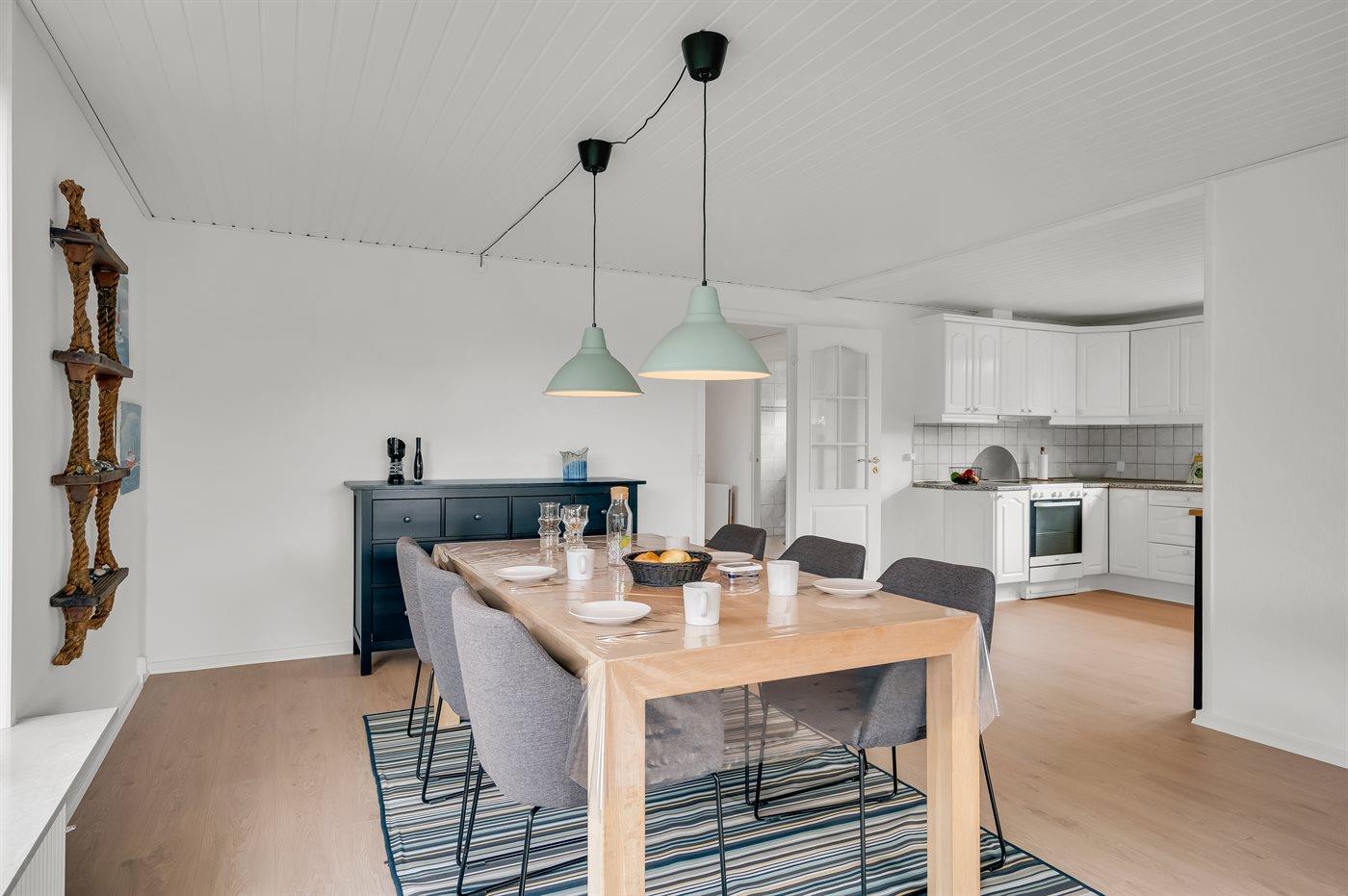 Køkkenet er udstyret med 1 køleskab. Der er 4 keramiske kogeplader, varmluftovn, mikrobølgeovn samt opvaskemaskine.