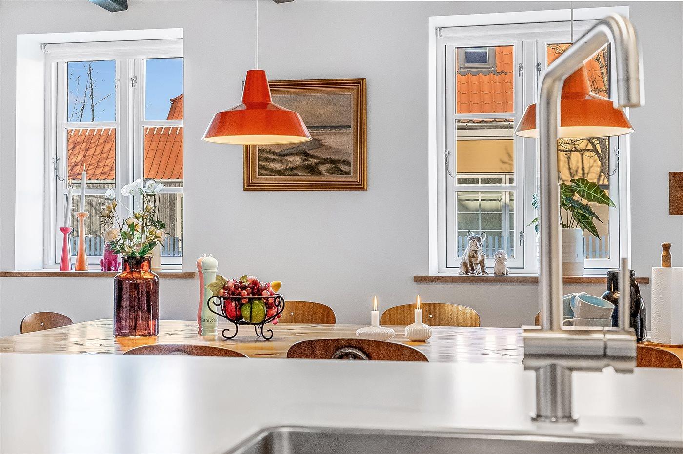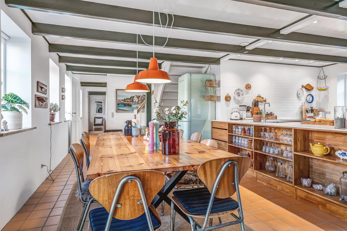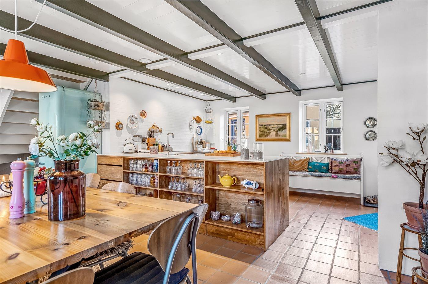Køkkenet er udstyret med 1 køleskab. Der er 4 induktionskogeplader, varmluftovn, mikrobølgeovn samt opvaskemaskine.