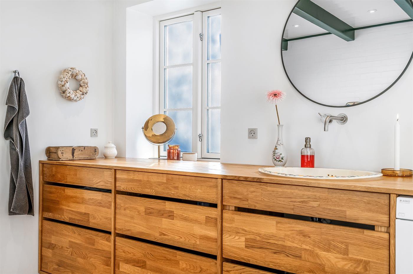 Der er 1 badeværelse med gulvvarme, badekar samt bruser og 1 badeværelse med gulvvarme og bruseniche.