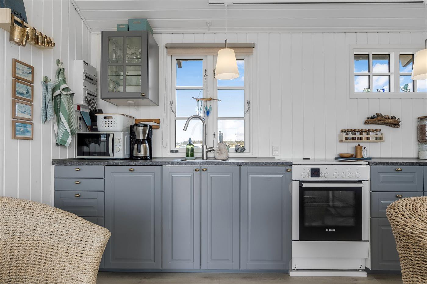 Køkkenet er udstyret med 1 køleskab. Der er 4 elkogeplader, varmluftovn, mikrobølgeovn samt opvaskemaskine.