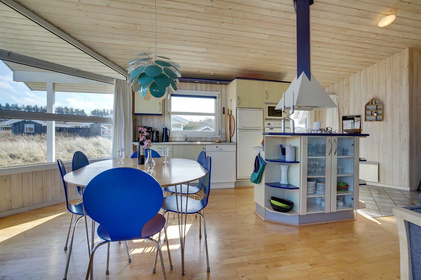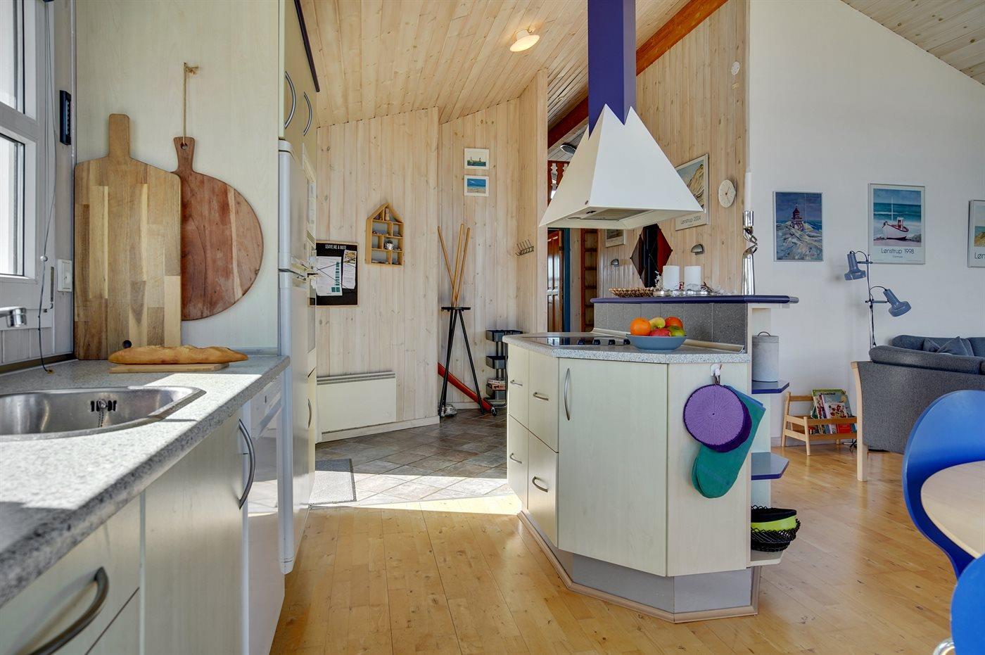 Køkkenet er udstyret med 1 køleskab. Der er 4 keramiske kogeplader, varmluftovn samt opvaskemaskine.