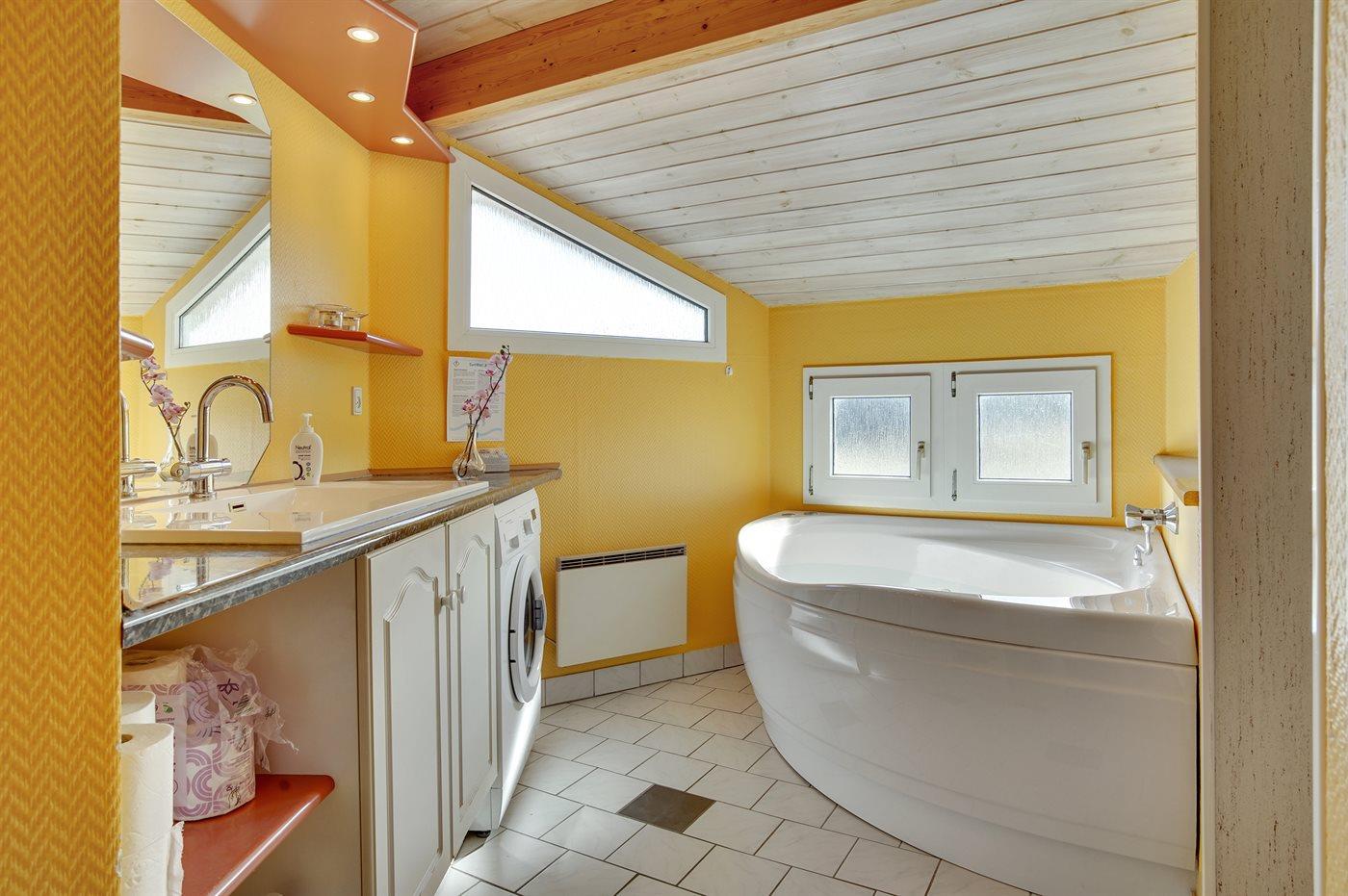 Der er 1 badeværelse med bruseniche og 1 toilet.. Der er gulvvarme på 1 badeværelse. I saunaen er der mulighed for afslapning.