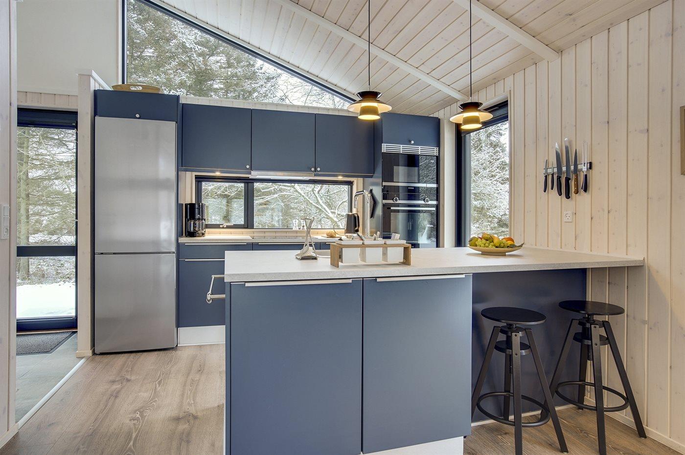 Køkkenet er udstyret med 1 køleskab. Der er 4 induktionskogeplader, varmluftovn, mikrobølgeovn samt opvaskemaskine.