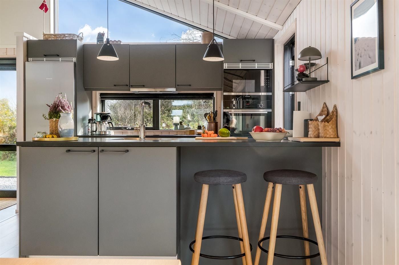 Køkkenet er udstyret med 1 køleskab. Der er 4 keramiske kogeplader, varmluftovn, mikrobølgeovn samt opvaskemaskine.